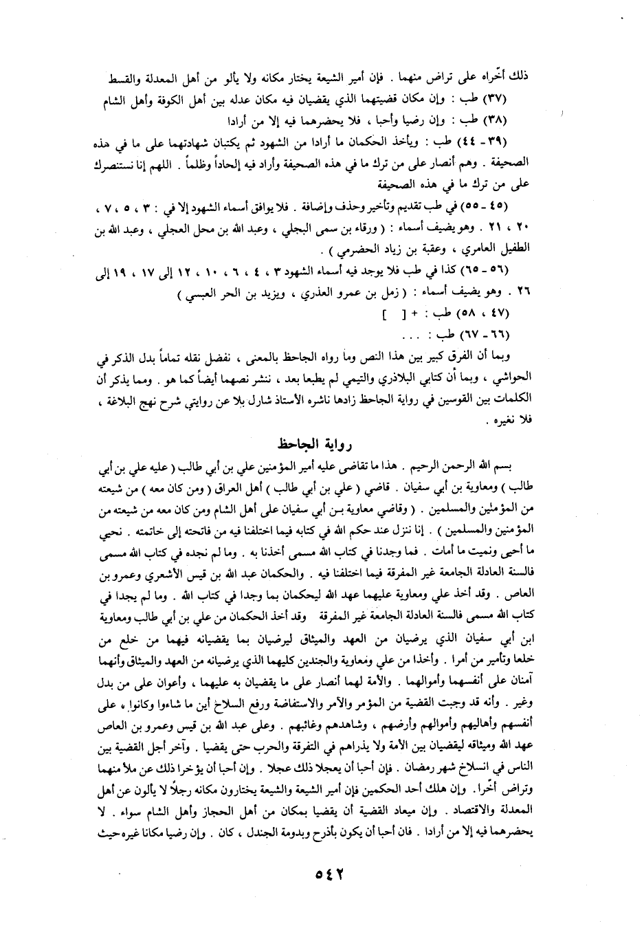 بسم الله الرحمن الرحيم. هذا ما تقاضى عليه أمير المؤمنين علي بن أبي طالب (عليه علي بن أبي طالب) ومعاوية بن أبي سفيان. قاضي (علي بن أبي طالب) أهل العراق (ومن كان معه) من شيعته من المؤمنين والمسلمين. (وقاضي معاوية بن أبي سفيان على أهل الشام ومن كان معه من شيعته من المؤمنين والمسلمين) . إنا ننزل عند حكم الله في كتابه فيما اختلفنا فيه من فاتحته إلى خاتمته. نحيي ما أحيى ونميت ما أمات. فما وجدنا في كتاب الله مسمى أخذنا به. وما لم نجده في كتاب الله مسمى فالسنة العادلة الجامعة غير المفرقة فيما اختلفنا فيه. والحكمان عبد الله بن قيس الأشعري وعمرو بن العاص. وقد أخذ علي ومعاوية عليهما عهد الله ليحكمان بما وجدا في كتاب الله. وما لم يجدا في كتاب الله مسمى فالسنة العادلة الجامعة غير المفرقة وقد أخذ الحكمان من علي بن أبي طالب ومعاوية ابن أبي سفيان الذي يرضيان من العهد والميثاق ليرضيان بما يقضيانه فيهما من خلع من خلعا وتأمير من أمرا. وأخذا من علي ومعاوية والجندين كليهما الذي يرضيانه من العهد والميثاق وأنهما آمنان على أنفسهما وأموالهما. والأمة لهما أنصار على ما يقضيان به عليهما، وأعوان على من بدل وغير. وأنه قد وجبت القضية من المؤمر والآمر والاستفاضة ورفع السلاح أين ما شاءوا وكانوا على أنفسهم وأهاليهم وأموالهم وأرضهم، وشاهدهم وغائبهم. وعلى عبد الله بن قيس وعمرو بن العاص عهد الله وميثاقه ليقضيان بين الأمة ولا يذراهم في التفرقة والحرب حتى يقضيا. وآخر أجل القضية بين الناس في انسلاخ شهر رمضان. فإن أحبا أن يعجلا ذلك عجلا. وإن أحبا أن يؤخرا ذلك عن ملأ منهما وتراض أخّرا. وإن هلك أحد الحكمين فإن أمير الشيعة والشيعة يختارون مكانه رجلا لا يألون عن أهل المعدلة والاقتصاد. وإن ميعاد القضية أن يقضيا بمكان من أهل الحجاز وأهل الشام سواء. لا يحضرهما فيه إلا من أرادا. فان أحبا أن يكون بأذرح وبدومة الجندل، كان. وإن رضيا مكانا غيره حيث