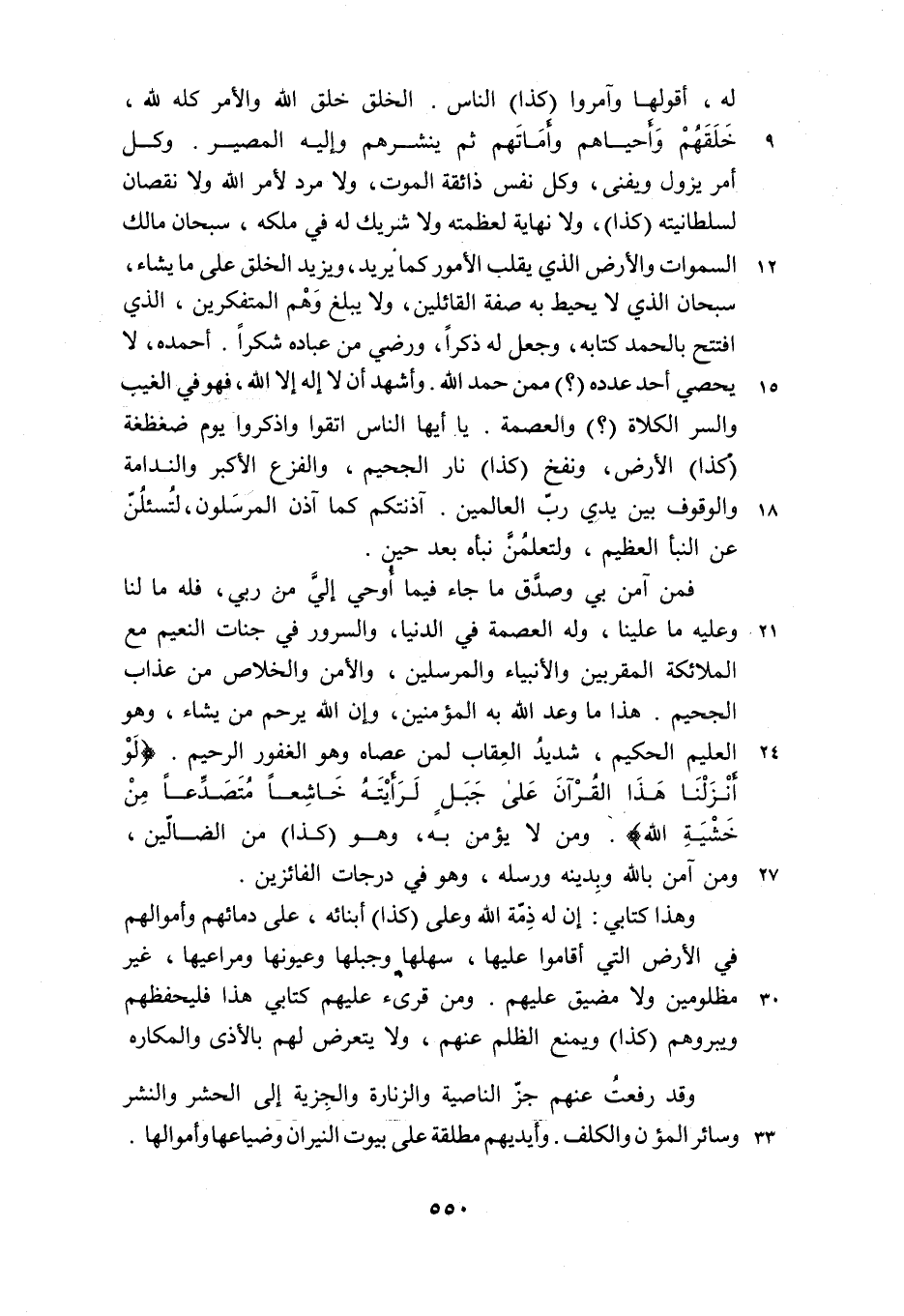 وهذا كتابي: إن له ذمّة الله وعلى (كذا) أبنائه، على دمائهم وأموالهم في الأرض التي أقاموا عليها، سهلها وجبلها وعيونها ومراعيها، غير مظلومين ولا مضيق عليهم. ومن قرىء عليهم كتابي هذا فليحفظهم ويبروهم (كذا) ويمنع الظلم عنهم، ولا يتعرض لهم بالأذى والمكاره