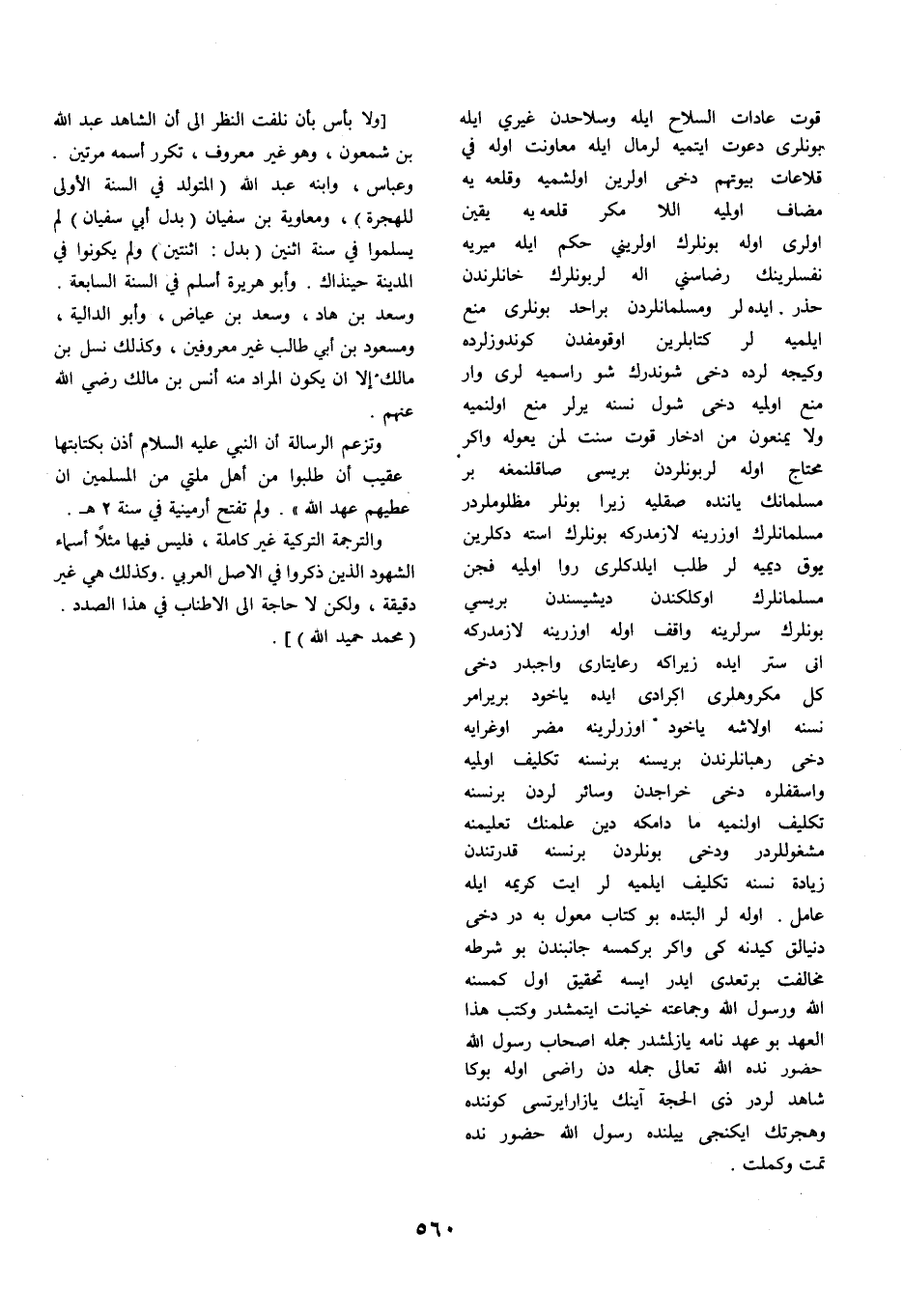 قوت عادات السلاح ايله وسلاحدن غيري ايله بونلرى دعوت ايتميه لرمال ايله معاونت اوله في قلاعات بيوتهم دخى اولرين اولشميه وقلعه يه مضاف اولميه اللا مكر قلعه يه يقين اولرى اوله بونلرك اولريني حكم ايله ميريه نفسلرينك رضا سني اله لربونلرك خانلرندن حذر. ايده لر ومسلمانلردن براحد بونلرى منع ايلميه لر كتابلرين اوقومفدن كوندوزلرده وكيجه لرده دخى شوندرك شو راسميه لرى وار منع اولميه دخى شول نسنه يرلر منع اولنميه ولا يمنعون من ادخار قوت سنت لمن يعوله واكر محتاج اوله لربونلردن بريسى صاقلنمغه بر مسلمانك ياننده صقليه زيرا بونلر مظلوملردر مسلمانلرك اوزرينه لا زمدركه بونلرك استه دكلرين يوق ديميه لر طلب ايلدكلرى روا اولميه فجن مسلمانلرك اوكلكندن ديشيسندن بريسي بونلرك سرلرينه واقف اوله اوزرينه لا زمدركه انى ستر ايده زيراكه رعايتارى واجبدر دخى كل مكروهلرى اكرادى ايده ياخود بريرامر نسنه اولاشه ياخود اوزرلرينه مضر اوغرايه دخى رهبانلرندن بريسنه برنسنه تكليف اولميه واسقفلره دخى خراجدن وسائر لردن برنسنه تكليف اولنميه ما دامكه دين علمنك تعليمنه مشغوللردر ودخى بونلردن برنسنه قدرتندن زيادة نسنه تكليف ايلميه لر ايت كريمه ايله عامل. اوله لر البتده بو كتاب معول به در دخى دنيالق كيدنه كى واكر بركمسه جانبندن بو شرطه مخالفت برتعدى ايدر ايسه تحقيق اول كمسنه الله ورسول الله وجماعته خيانت ايتمشدر وكتب هذا العهد بو عهد نامه يازلمشدر جمله اصحاب رسول الله حضور نده الله تعالى جمله دن راضى اوله بوكا شاهد لردر ذى الحجة آينك يازارايرتسى كوننده وهجرتك ايكنجى ييلنده رسول الله حضور نده تمت وكملت.