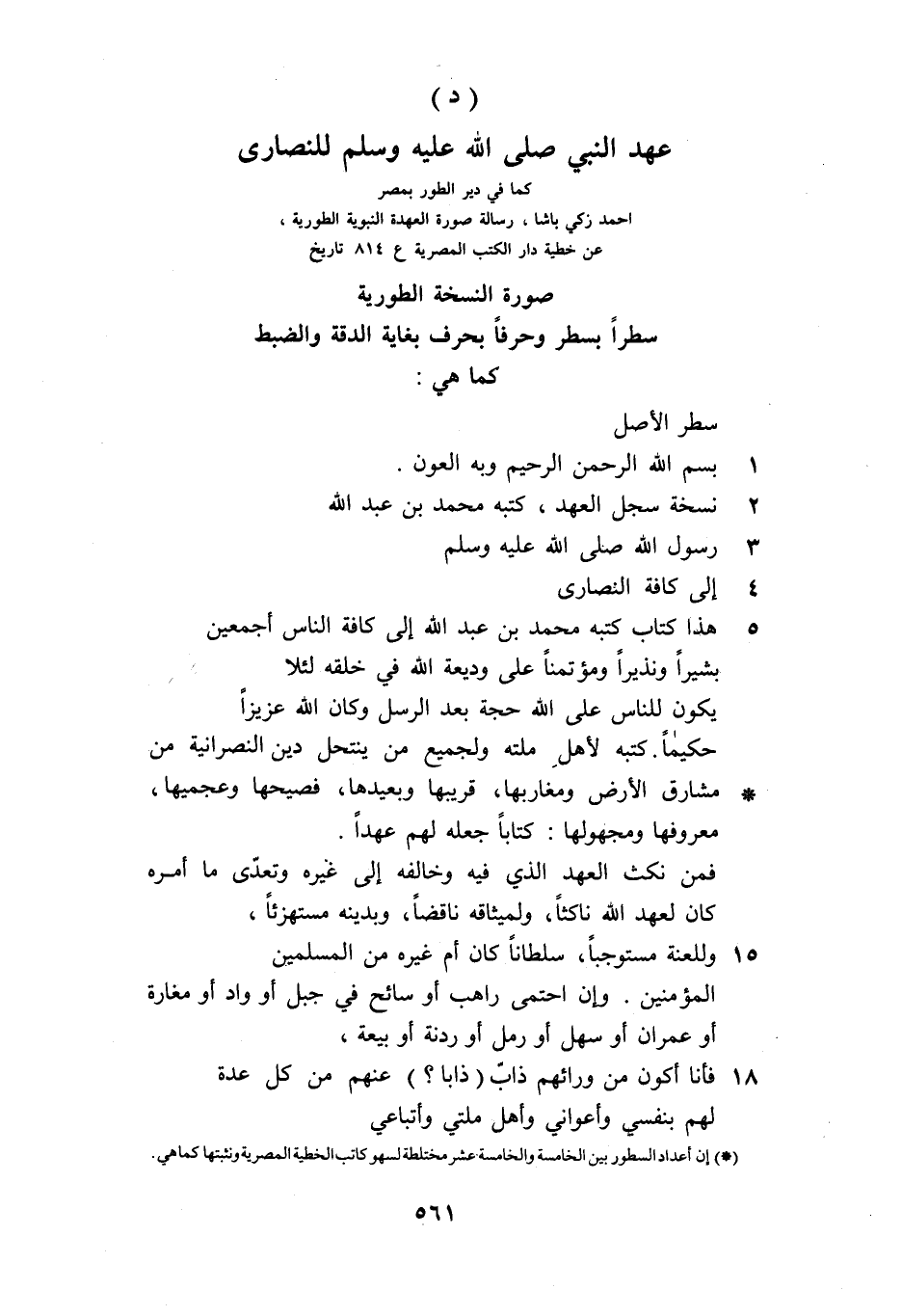 كما في دير الطور بمصر احمد زكي باشا، رسالة صورة العهدة النبوية الطورية، عن خطية دار الكتب المصرية ع 814 تاريخ