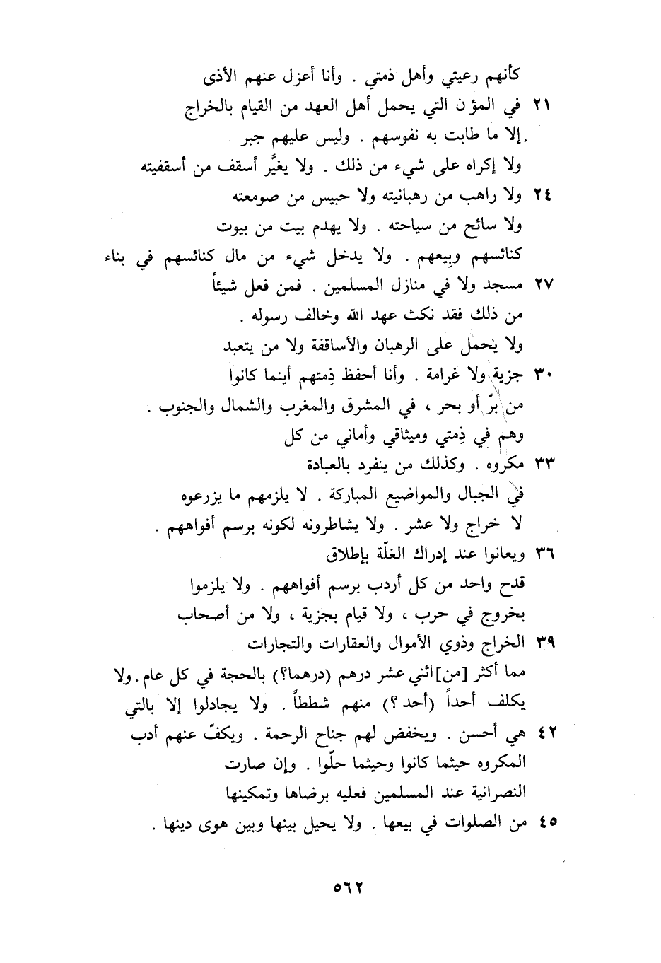 36 ويعانوا عند إدراك الغلّة بإطلاق قدح واحد من كل أردب برسم أفواههم. ولا يلزموا بخروج في حرب، ولا قيام بجزية، ولا من أصحاب 39 الخراج وذوي الأموال والعقارات والتجارات مما أكثر [من] اثني عشر درهم (درهما؟) بالحجة في كل عام. ولا يكلف أحدا (أحد؟) منهم شططا. ولا يجادلوا إلا بالتي 42 هي أحسن. ويخفض لهم جناح الرحمة. ويكفّ عنهم أدب المكروه حيثما كانوا وحيثما حلّوا. وإن صارت النصرانية عند المسلمين فعليه برضاها وتمكينها 45 من الصلوات في بيعها. ولا يحيل بينها وبين هوى دينها.