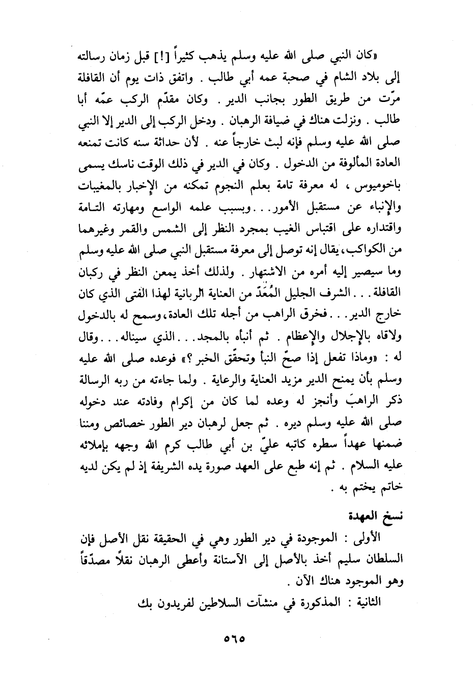 «كان النبي صلى الله عليه وسلم يذهب كثيرا [!] قبل زمان رسالته إلى بلاد الشام في صحبة عمه أبي طالب. واتفق ذات يوم أن القافلة مرّت من طريق الطور بجانب الدير. وكان مقدّم الركب عمّه أبا طالب. ونزلت هناك في ضيافة الرهبان. ودخل الركب إلى الدير إلا النبي صلى الله عليه وسلم فإنه لبث خارجا عنه. لأن حداثة سنه كانت تمنعه العادة المألوفة من الدخول. وكان في الدير في ذلك الوقت ناسك يسمى باخوميوس، له معرفة تامة بعلم النجوم تمكنه من الإخبار بالمغيبات والإنباء عن مستقبل الأمور.. وبسبب علمه الواسع ومهارته التامة واقتداره على اقتباس الغيب بمجرد النظر إلى الشمس والقمر وغيرهما من الكواكب، يقال إنه توصل إلى معرفة مستقبل النبي صلى الله عليه وسلم وما سيصير إليه أمره من الاشتهار. ولذلك أخذ يمعن النظر في ركبان القافلة ... الشرف الجليل المعدّ من العناية الربانية لهذا الفتى الذي كان خارج الدير ... فخرق الراهب من أجله تلك العادة، وسمح له بالدخول ولاقاه بالإجلال والإعظام. ثم أنبأه بالمجد ... الذي سيناله ... وقال له: «وماذا تفعل إذا صحّ النبأ وتحقّق الخبر؟» فوعده صلى الله عليه وسلم بأن يمنح الدير مزيد العناية والرعاية. ولما جاءته من ربه الرسالة ذكر الراهب وأنجز له وعده لما كان من إكرام وفادته عند دخوله صلى الله عليه وسلم ديره. ثم جعل لرهبان دير الطور خصائص ومننا ضمنها عهدا سطره كاتبه عليّ بن أبي طالب كرم الله وجهه بإملائه عليه السلام. ثم إنه طبع على العهد صورة يده الشريفة إذ لم يكن لديه خاتم يختم به.