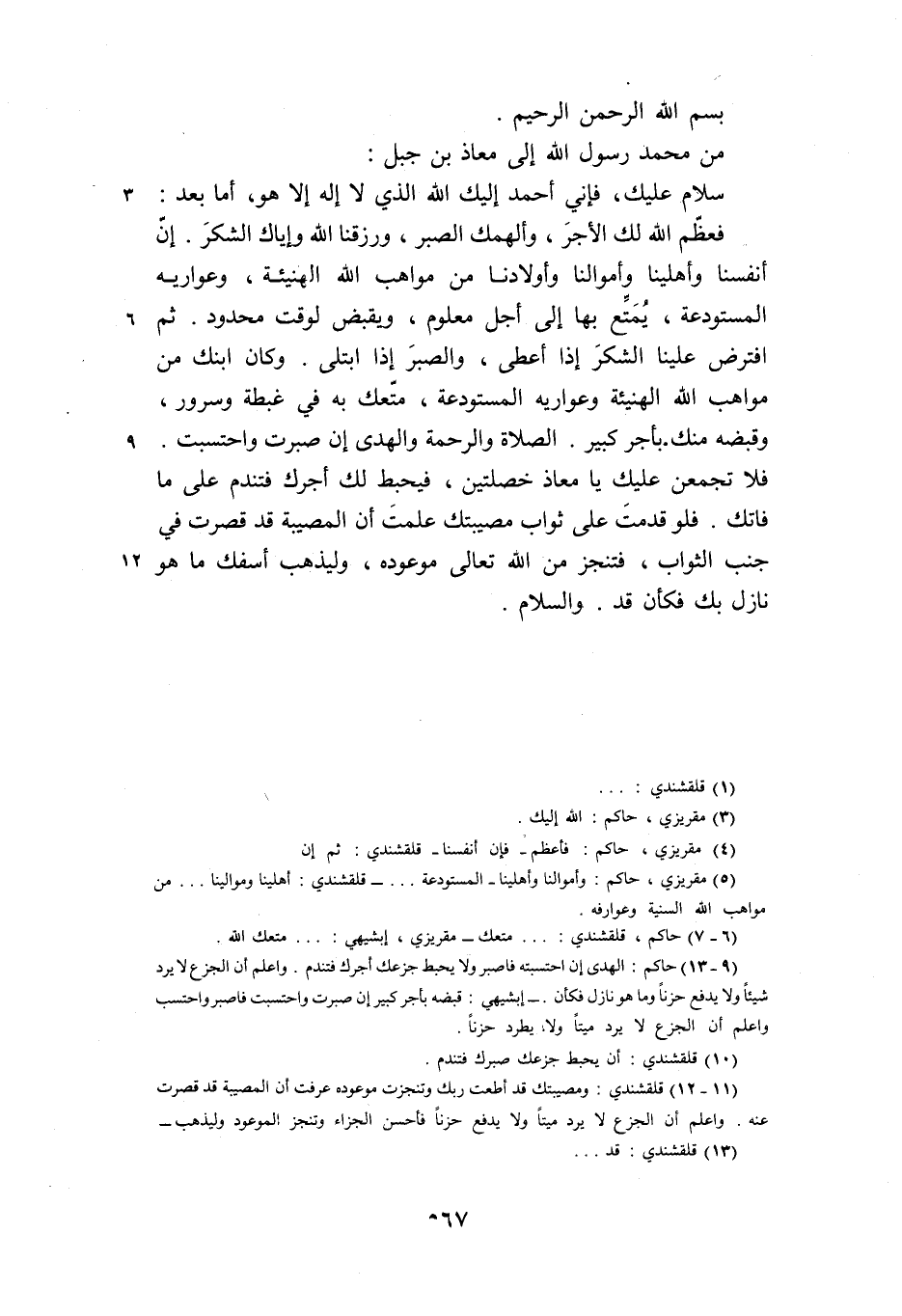 (11- 12) قلقشندي: ومصيبتك قد أطعت ربك وتنجزت موعوده عرفت أن المصيبة قد قصرت عنه. واعلم أن الجزع لا يرد ميتا ولا يدفع حزنا فأحسن الجزاء وتنجز الموعود وليذهب-