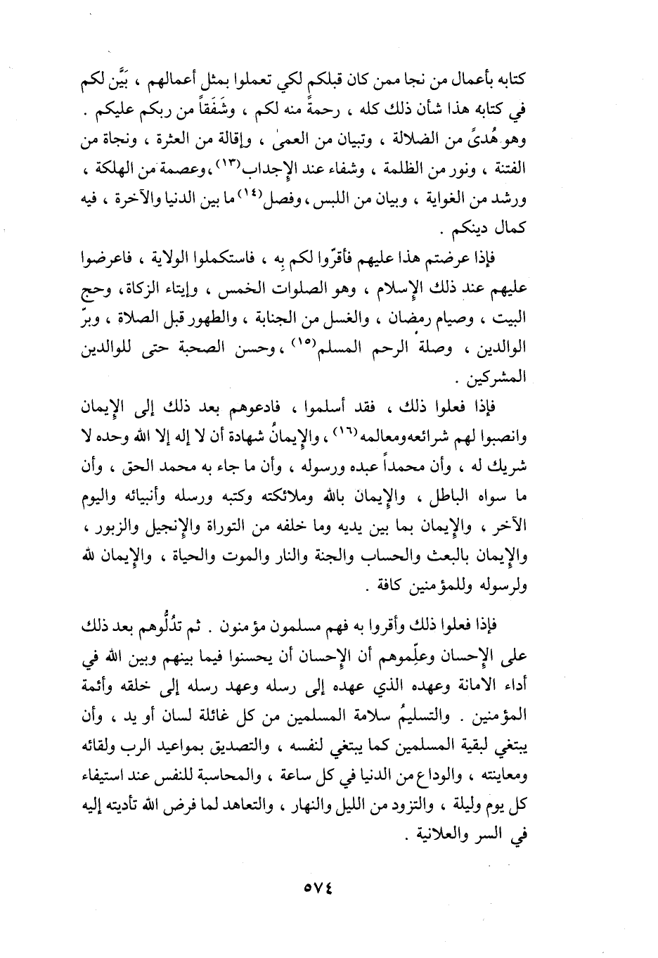 فإذا فعلوا ذلك، فقد أسلموا، فادعوهم بعد ذلك إلى الإيمان وانصبوا لهم شرائعه ومعالمه «4» ، والإيمان شهادة أن لا إله إلا الله وحده لا شريك له، وأن محمدا عبده ورسوله، وأن ما جاء به محمد الحق، وأن ما سواه الباطل، والإيمان بالله وملائكته وكتبه ورسله وأنبيائه واليوم الآخر، والإيمان بما بين يديه وما خلفه من التوراة والإنجيل والزبور، والإيمان بالبعث والحساب والجنة والنار والموت والحياة، والإيمان لله ولرسوله وللمؤمنين كافة.