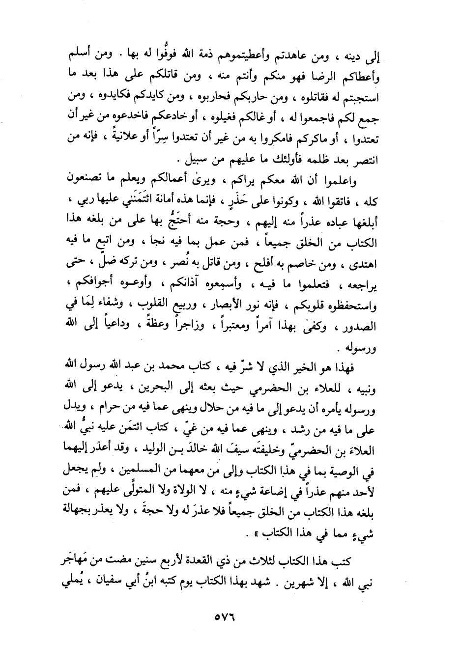 فهذا هو الخير الذي لا شرّ فيه، كتاب محمد بن عبد الله رسول الله ونبيه، للعلاء بن الحضرمي حيث بعثه إلى البحرين، يدعو إلى الله ورسوله يأمره أن يدعو إلى ما فيه من حلال وينهى عما فيه من حرام، ويدل على ما فيه من رشد، وينهى عما فيه من غيّ، كتاب ائتمن عليه نبيّ الله العلاء بن الحضرميّ وخليفته سيف الله خالد بن الوليد، وقد أعذر إليهما في الوصية بما في هذا الكتاب وإلى من معهما من المسلمين، ولم يجعل لأحد منهم عذرا في إضاعة شيء منه، لا الولاة ولا المتولّى عليهم، فمن بلغه هذا الكتاب من الخلق جميعا فلا عذر له ولا حجة، ولا يعذر بجهالة شيء مما في هذا الكتاب» .