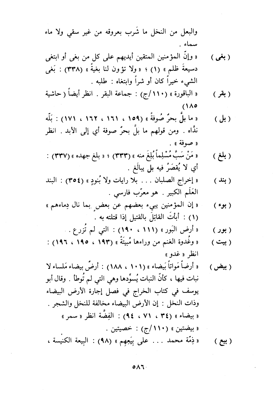 (بغى) «وإنّ المؤمنين المتقين أيديهم على كل من بغى أو ابتغى دسيعة ظلم» (1) ؛ «ولا تؤون لنا بغية» (338) : بغى الشيء خيرا كان أو شرا وابتغاه: طلبه.