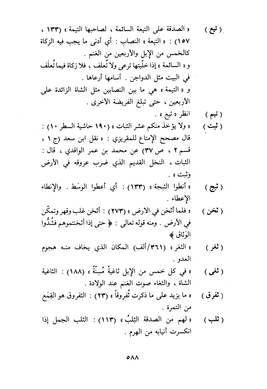 (تيع) «الصدقة على التيعة السائمة، لصاحبها التيمة» (133، 157) : «التيعة» النصاب: أي أدنى ما يجب فيه الزكاة كالخمس من الإبل والأربعين من الغنم.