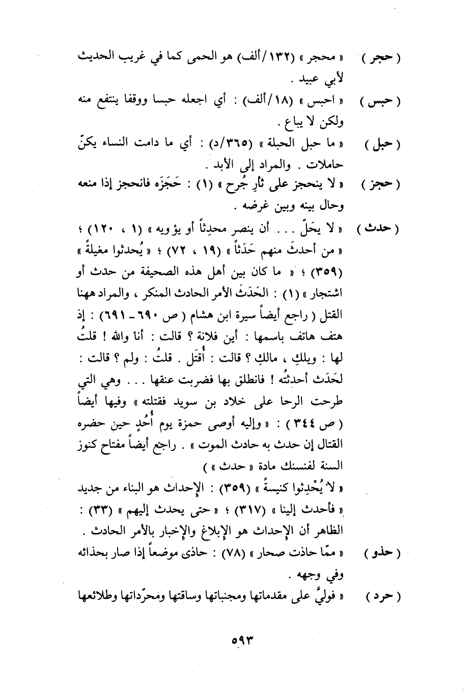 (حدث) «لا يحلّ ... أن ينصر محدثا أو يؤويه» (1، 120) ؛ «من أحدث منهم حدثا» (19، 72) ؛ «يحدثوا مغيلة» (359) ؛ «ما كان بين أهل هذه الصحيفة من حدث أو اشتجار» (1) : الحدث الأمر الحادث المنكر، والمراد ههنا القتل (راجع أيضا سيرة ابن هشام (ص 690- 691) : إذ هتف هاتف باسمها: أين فلانة؟ قالت: أنا والله! قلت لها: ويلك، مالك؟ قالت: أقتل. قلت: ولم؟ قالت: