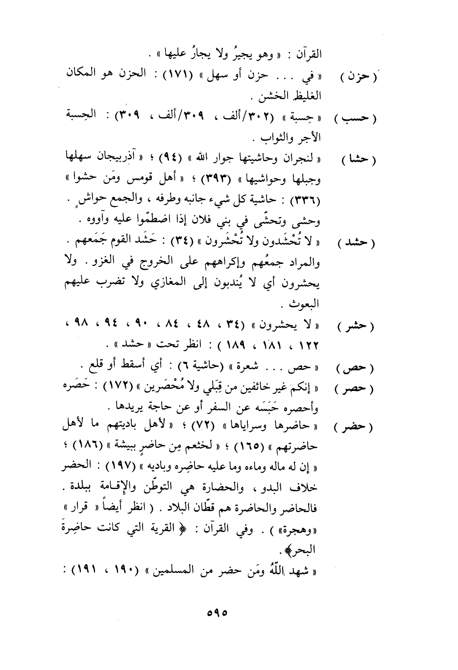 (حشا) «لنجران وحاشيتها جوار الله» (94) ؛ «آذربيجان سهلها وجبلها وحواشيها» (393) ؛ «أهل قومس ومن حشوا» (336) : حاشية كل شيء جانبه وطرفه، والجمع حواش.