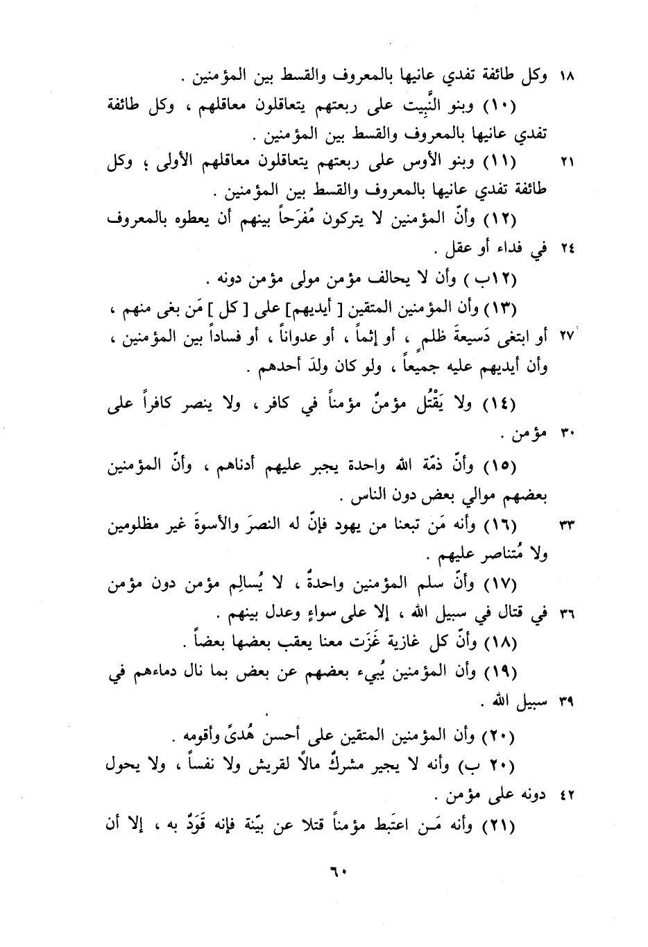 (15) وأنّ ذمّة الله واحدة يجبر عليهم أدناهم، وأنّ المؤمنين بعضهم موالي بعض دون الناس.
