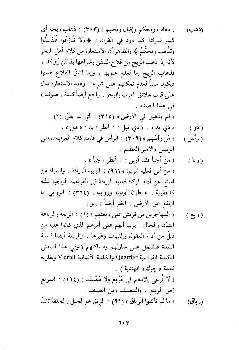 (ذهب) «ذهاب ريحكم وإقبال ريحهم» (303) : ذهاب ريحه أي كسر شوكته كما ورد في القرآن: وَلا تَنازَعُوا فَتَفْشَلُوا وَتَذْهَبَ رِيحُكُمْ والظاهر أن الاستعارة من كلام أهل البحر لأنه إذا ذهب الريح من قلاع السفن وشراعها يظللن رواكد، فذهاب الريح إما لعدم هبوبها، وإما لشقّ القلاع نفسها فيكون سببا لعدم تمكنهم على شيء. وهذه الاستعارة تدل على قرب علائق العرب بالبحر. راجع أيضا كلمة «صوف» في هذا الصدد.
