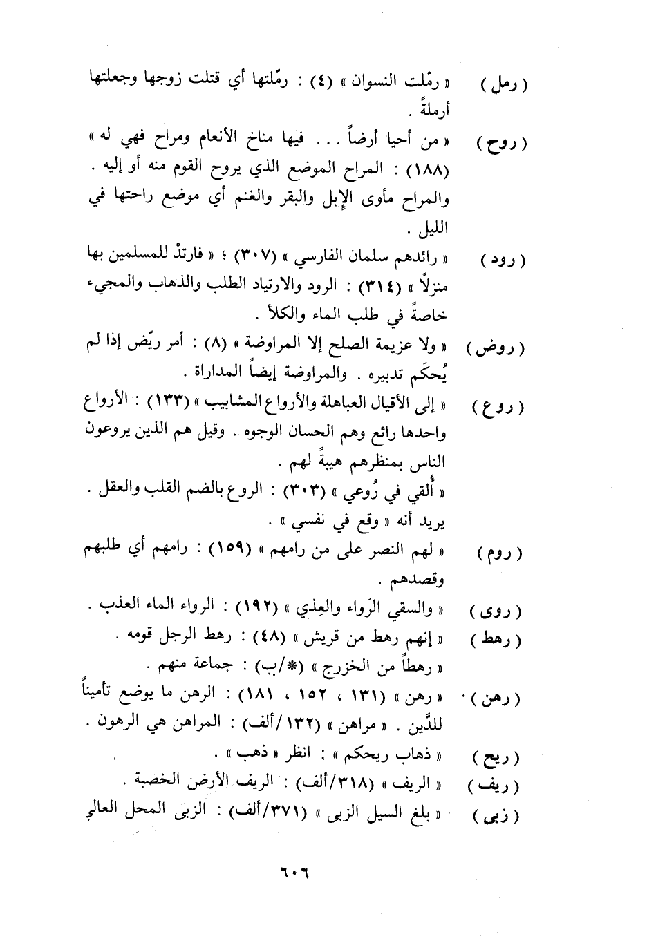 (رود) «رائدهم سلمان الفارسي» (307) ؛ «فارتد للمسلمين بها منزلا» (314) : الرود والارتياد الطلب والذهاب والمجيء خاصة في طلب الماء والكلأ.
