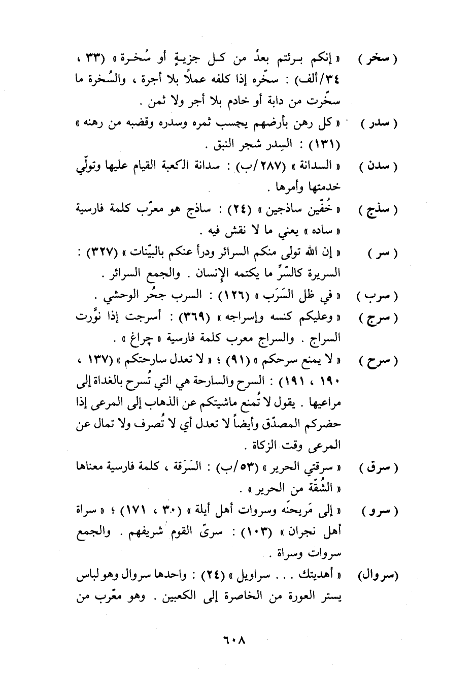 (سرح) «لا يمنع سرحكم» (91) ؛ «لا تعدل سارحتكم» (137، 190، 191) : السرح والسارحة هي التي تسرح بالغداة إلى مراعيها. يقول لا تمنع ماشيتكم عن الذهاب إلى المرعى إذا حضركم المصدّق وأيضا لا تعدل أي لا تصرف ولا تمال عن المرعى وقت الزكاة.
