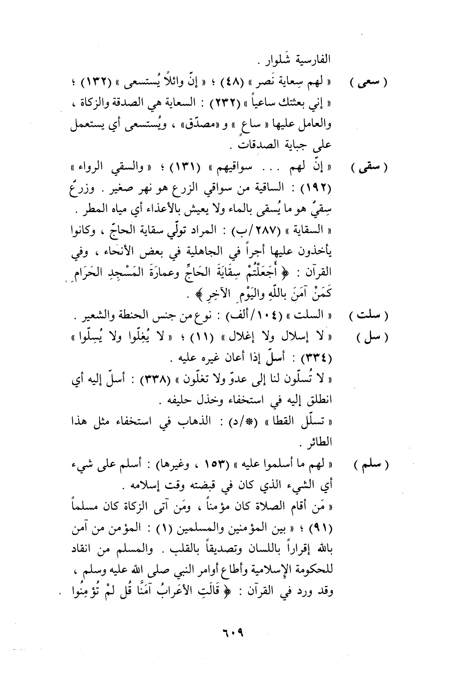 (سلم) «لهم ما أسلموا عليه» (153، وغيرها) : أسلم على شيء أي الشيء الذي كان في قبضته وقت إسلامه.