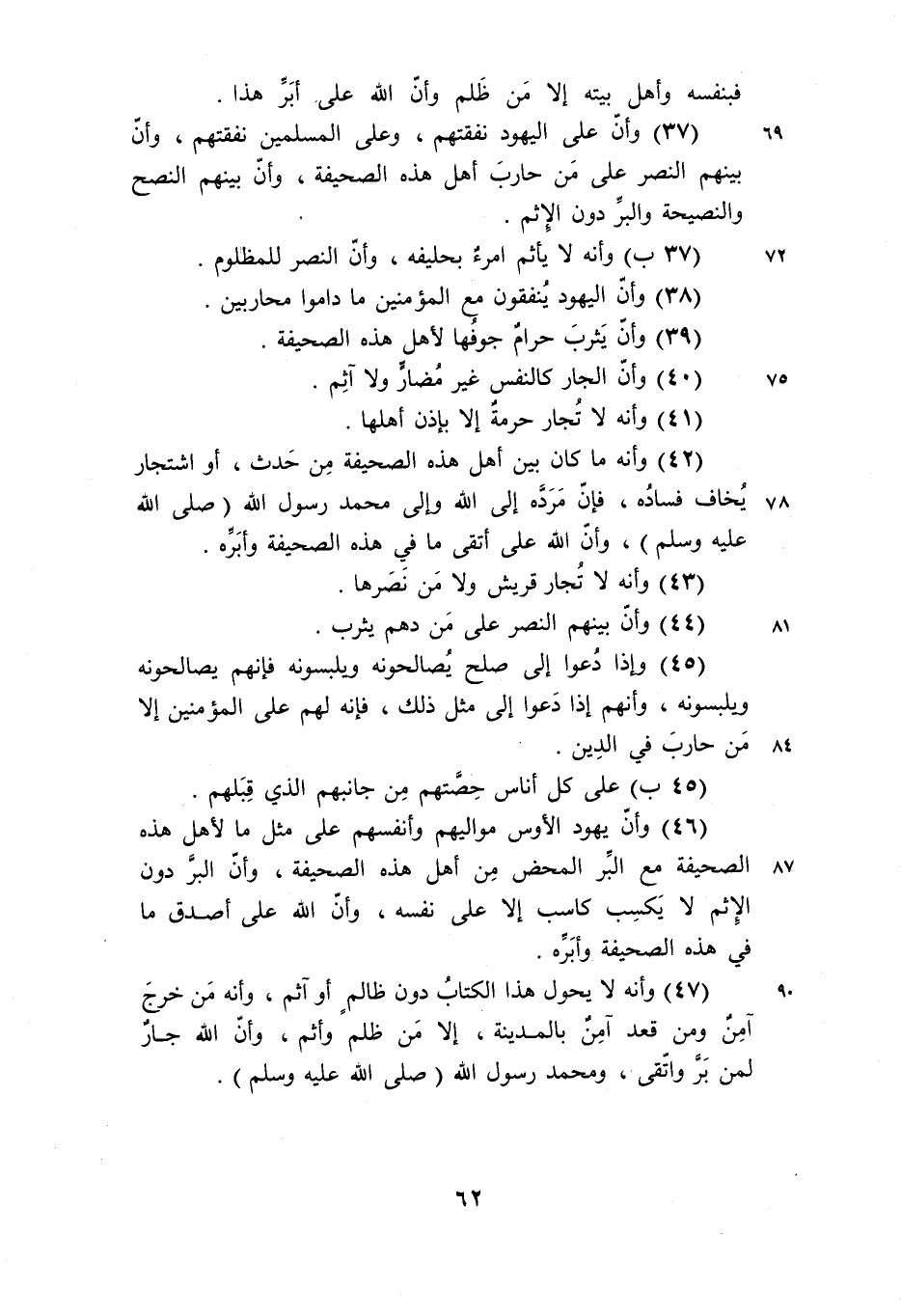 (42) وأنه ما كان بين أهل هذه الصحيفة من حدث، أو اشتجار يخاف فساده، فإنّ مردّه إلى الله وإلى محمد رسول الله (صلى الله عليه وسلم) ، وأنّ الله على أتقى ما في هذه الصحيفة وأبرّه.