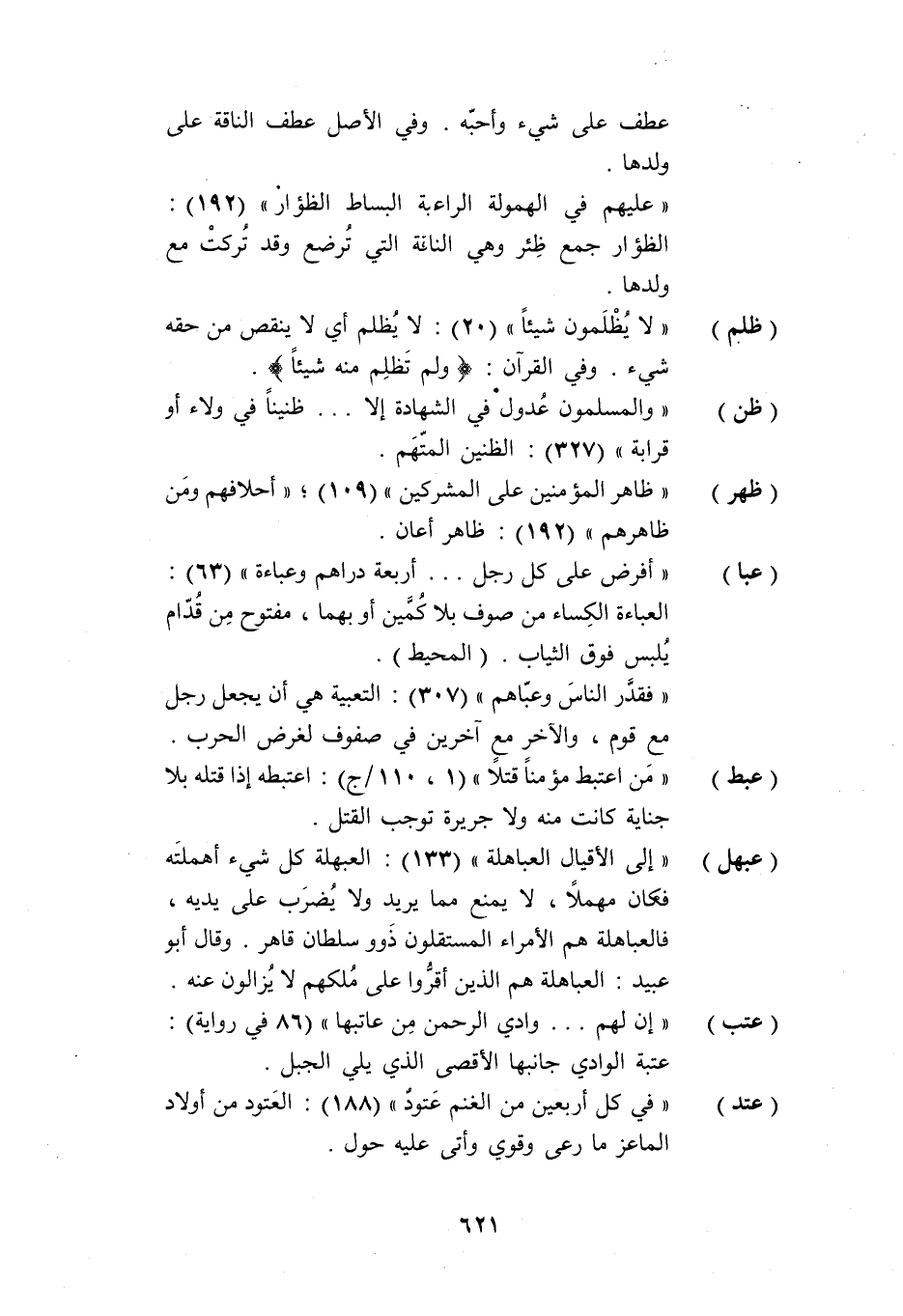(ظهر) «ظاهر المؤمنين على المشركين» (109) ؛ «أحلافهم ومن ظاهرهم» (192) : ظاهر أعان.