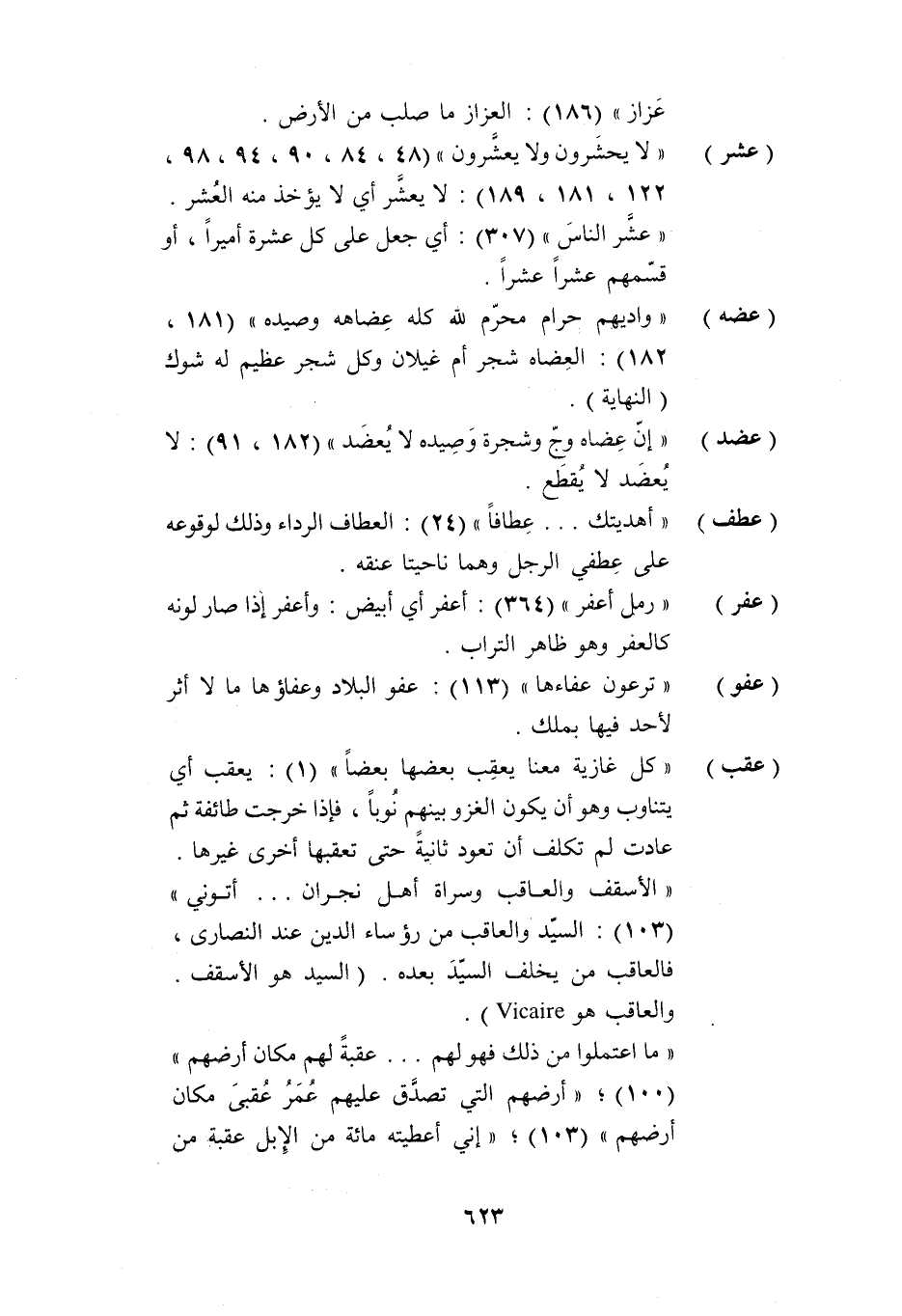 (عشر) «لا يحشرون ولا يعشّرون» (48، 84، 90، 94، 98، 122، 181، 189) : لا يعشّر أي لا يؤخذ منه العشر.
