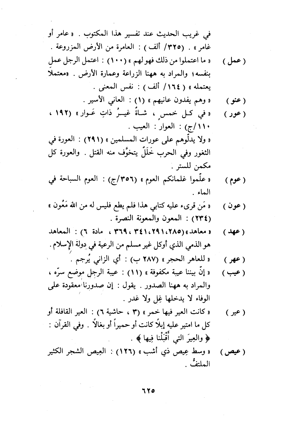 (عمل) «ما اعتملوا من ذلك فهو لهم» (100) : اعتمل الرجل عمل بنفسه؛ والمراد به ههنا الزراعة وعمارة الأرض. «معتملا يعتمله» (164/ ألف) : نفس المعنى.