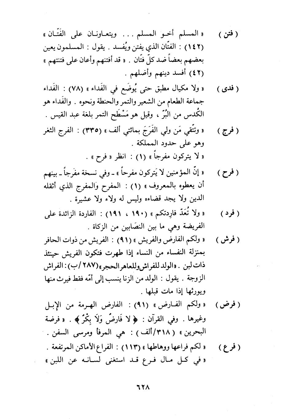 (فرش) «ولكم الفارض والفريش» (91) : الفريش من ذوات الحافر بمنزلة النفساء من النساء إذا طهرت فتكون الفريش حينئذ ذات لبن. «الولد للفراش وللعاهر الحجر» (287/ ب) : الفراش الزوجة. يقول: الولد من الزنا ينسب إلى أمّه فقط فيرث منها ويورثها إذا مات قبلها.