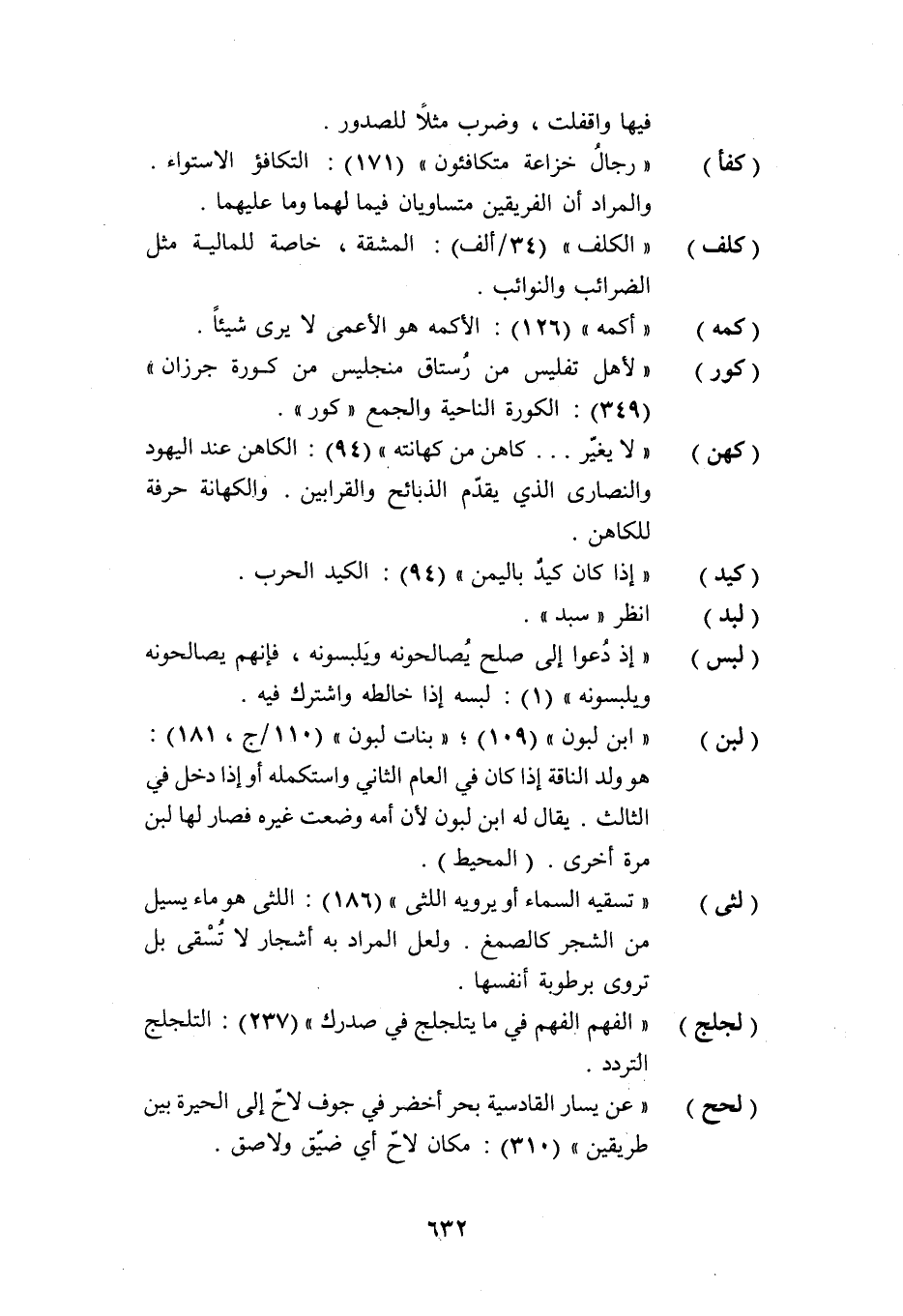 (لحح) «عن يسار القادسية بحر أخضر في جوف لاحّ إلى الحيرة بين طريقين» (310) : مكان لاحّ أي ضيّق ولاصق.