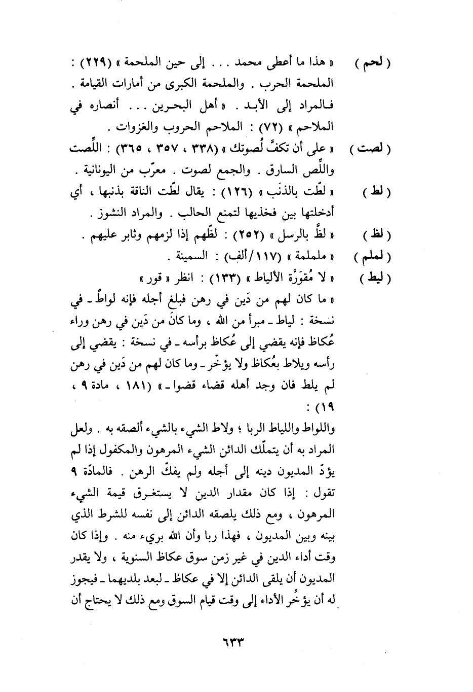 واللواط واللياط الربا؛ ولاط الشيء بالشيء ألصقه به. ولعل المراد به أن يتملّك الدائن الشيء المرهون والمكفول إذا لم يؤدّ المديون دينه إلى أجله ولم يفكّ الرهن. فالمادّة 9 تقول: إذا كان مقدار الدين لا يستغرق قيمة الشيء المرهون، ومع ذلك يلصقه الدائن إلى نفسه للشرط الذي بينه وبين المديون، فهذا ربا وأن الله بريء منه. وإذا كان وقت أداء الدين في غير زمن سوق عكاظ السنوية، ولا يقدر المديون أن يلقى الدائن إلا في عكاظ- لبعد بلديهما- فيجوز له أن يؤخّر الأداء إلى وقت قيام السوق ومع ذلك لا يحتاج أن