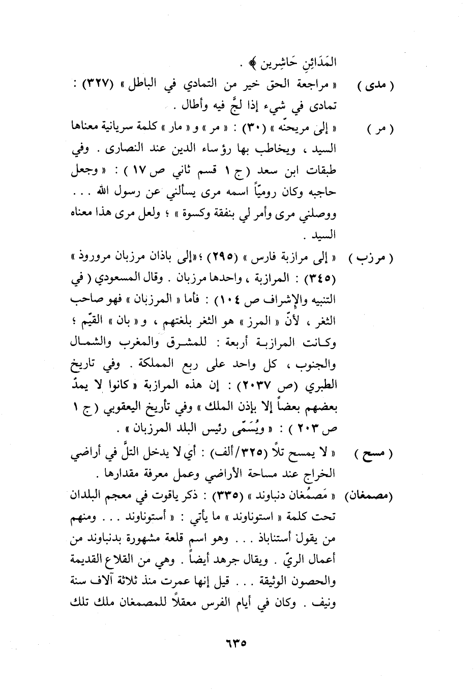 (مرزب) «إلى مرازبة فارس» (295) ؛ «إلى باذان مرزبان مروروذ» (345) : المرازبة، واحدها مرزبان. وقال المسعودي (في التنبيه والإشراف ص 104) : فأما «المرزبان» فهو صاحب الثغر، لأنّ «المرز» هو الثغر بلغتهم، و «بان» القيّم؛ وكانت المرازبة أربعة: للمشرق والمغرب والشمال والجنوب، كل واحد على ربع المملكة. وفي تاريخ الطبري (ص 2037) : إن هذه المرازبة «كانوا لا يمدّ بعضهم بعضا إلا بإذن الملك» وفي تأريخ اليعقوبي (ج 1 ص 203) : «ويسمّى رئيس البلد المرزبان» .