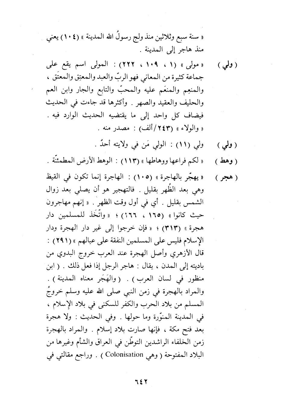 (ولي) «مولى» (1، 109، 222) : المولى اسم يقع على جماعة كثيرة من المعاني فهو الربّ والعبد والمعتق والمعتق، والمنعم والمنعم عليه والمحبّ والتابع والجار وابن العم والحليف والعقيد والصهر. وأكثرها قد جاءت في الحديث فيضاف كل واحد إلى ما يقتضيه الحديث الوارد فيه.