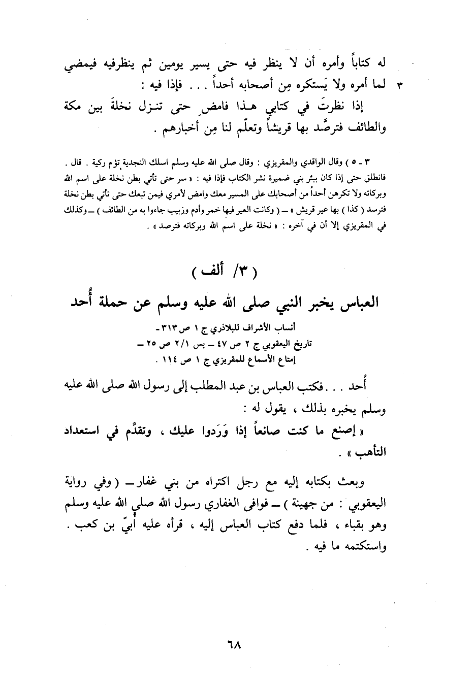 أحد ... فكتب العباس بن عبد المطلب إلى رسول الله صلى الله عليه وسلم يخبره بذلك، يقول له: