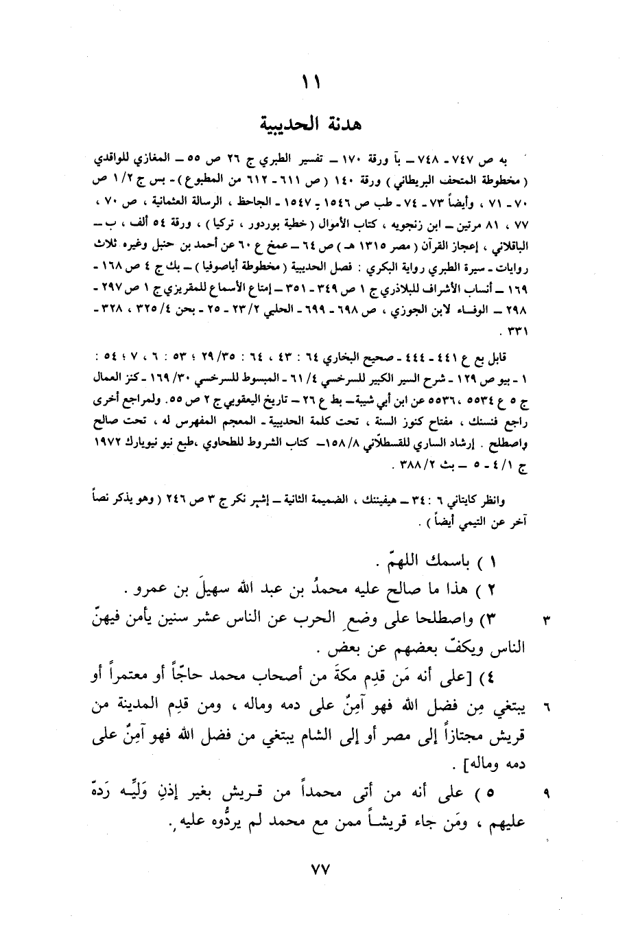 1- بيو ص 129- شرح السير الكبير للسرخسي 4/ 61- المبسوط للسرخسي 30/ 169- كنز العمال ج 5 ع 5534، 5536 عن ابن أبي شيبة- بط ع 26- تاريخ اليعقوبي ج 2 ص 55. ولمراجع أخرى راجع فنسنك، مفتاح كنوز السنة، تحت كلمة الحديبية- المعجم المفهرس له، تحت صالح واصطلح. إرشاد الساري للقسطلّاني 8/ 158- كتاب الشروط للطحاوي، طبع نيو نيويارك 1972 ج 1/ 4- 5- بث 2/ 388.