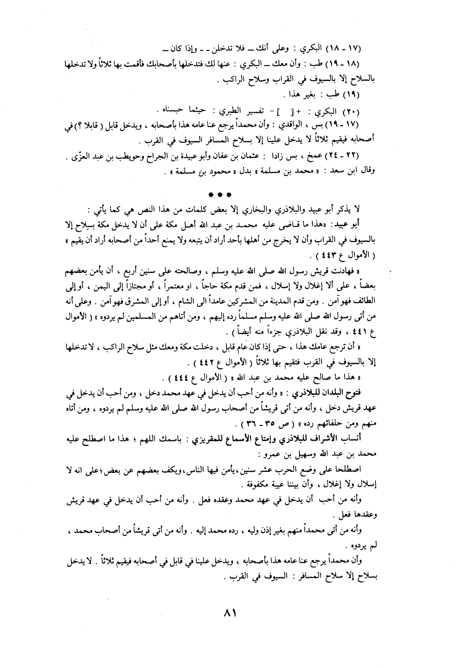 (17- 19) بس، الواقدي: وأن محمدا يرجع عنا عامه هذا بأصحابه، ويدخل قابل (قابلا؟) في أصحابه فيقيم ثلاثا لا يدخل علينا إلا بسلاح المسافر السيوف في القرب.