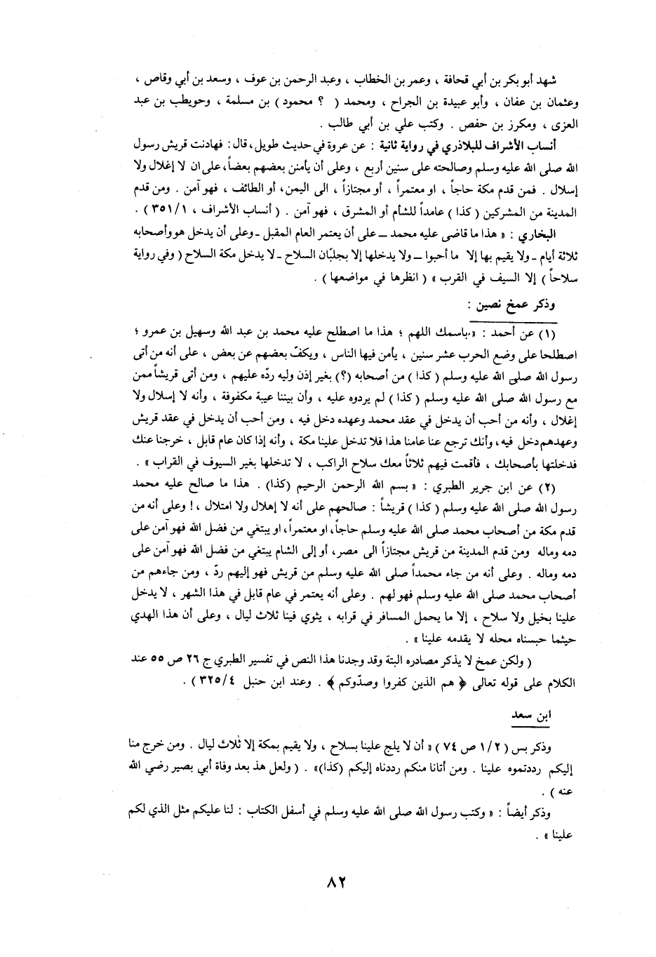 (2) عن ابن جرير الطبري: «بسم الله الرحمن الرحيم (كذا) . هذا ما صالح عليه محمد رسول الله صلى الله عليه وسلم (كذا) قريشا: صالحهم على أنه لا إهلال ولا امتلال،! وعلى أنه من قدم مكة من أصحاب محمد صلى الله عليه وسلم حاجا، او معتمرا، او يبتغي من فضل الله فهو آمن على دمه وماله ومن قدم المدينة من قريش مجتازا الى مصر، أو إلى الشام يبتغي من فضل الله فهو آمن على دمه وماله. وعلى أنه من جاء محمدا صلى الله عليه وسلم من قريش فهو إليهم ردّ، ومن جاءهم من أصحاب محمد صلى الله عليه وسلم فهو لهم. وعلى أنه يعتمر في عام قابل في هذا الشهر، لا يدخل علينا بخيل ولا سلاح، إلا ما يحمل المسافر في قرابه، يثوي فينا ثلاث ليال، وعلى أن هذا الهدي حيثما حبسناه محله لا يقدمه علينا» .