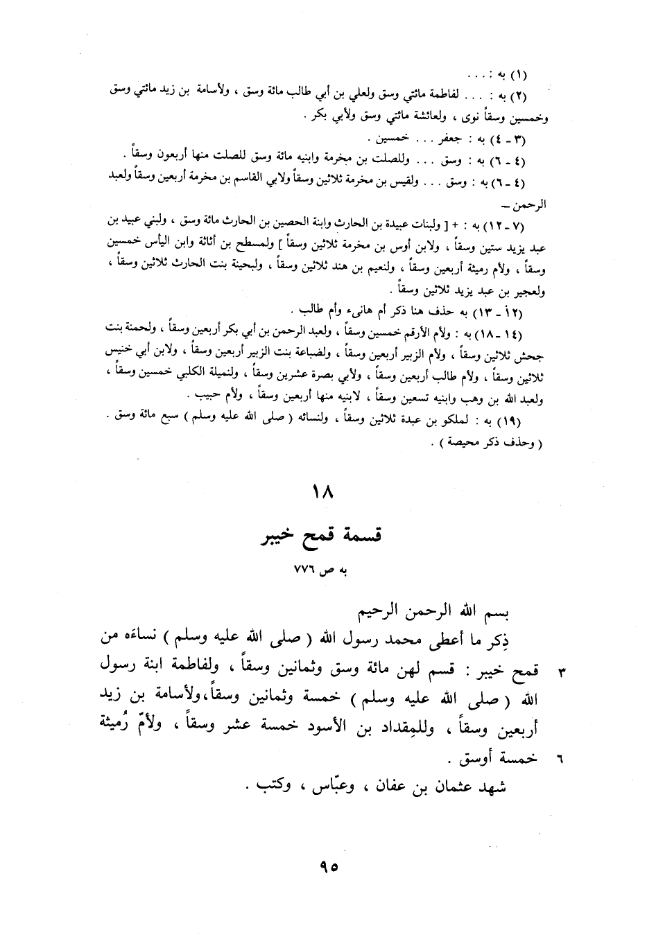 (14- 18) به: ولأم الأرقم خمسين وسقا، ولعبد الرحمن بن أبي بكر أربعين وسقا، ولحمنة بنت جحش ثلاثين وسقا، ولأم الزبير أربعين وسقا، ولضباعة بنت الزبير أربعين وسقا، ولابن أبي خنيس ثلاثين وسقا، ولأم طالب أربعين وسقا، ولأبي بصرة عشرين وسقا، ولنميلة الكلبي خمسين وسقا، ولعبد الله بن وهب وابنيه تسعين وسقا، لابنيه منها أربعين وسقا، ولأم حبيب.