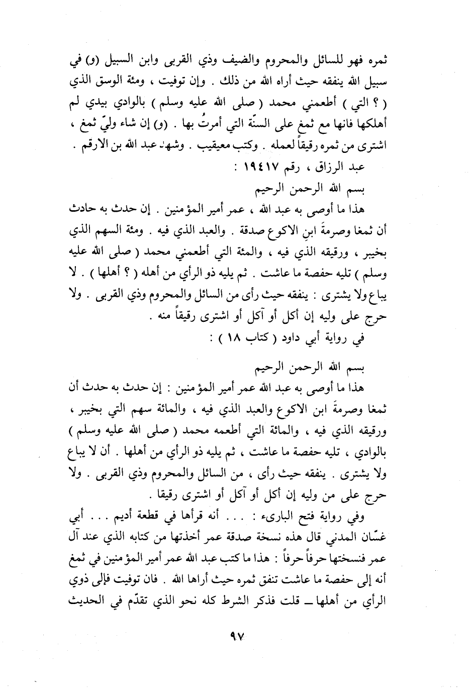 هذا ما أوصى به عبد الله عمر أمير المؤمنين: إن حدث به حدث أن ثمغا وصرمة ابن الاكوع والعبد الذي فيه، والمائة سهم التي بخيبر، ورقيقه الذي فيه، والمائة التي أطعمه محمد (صلى الله عليه وسلم) بالوادي، تليه حفصة ما عاشت، ثم يليه ذو الرأي من أهلها. أن لا يباع ولا يشترى. ينفقه حيث رأى، من السائل والمحروم وذي القربى. ولا حرج على من وليه إن أكل أو آكل أو اشترى رقيقا.