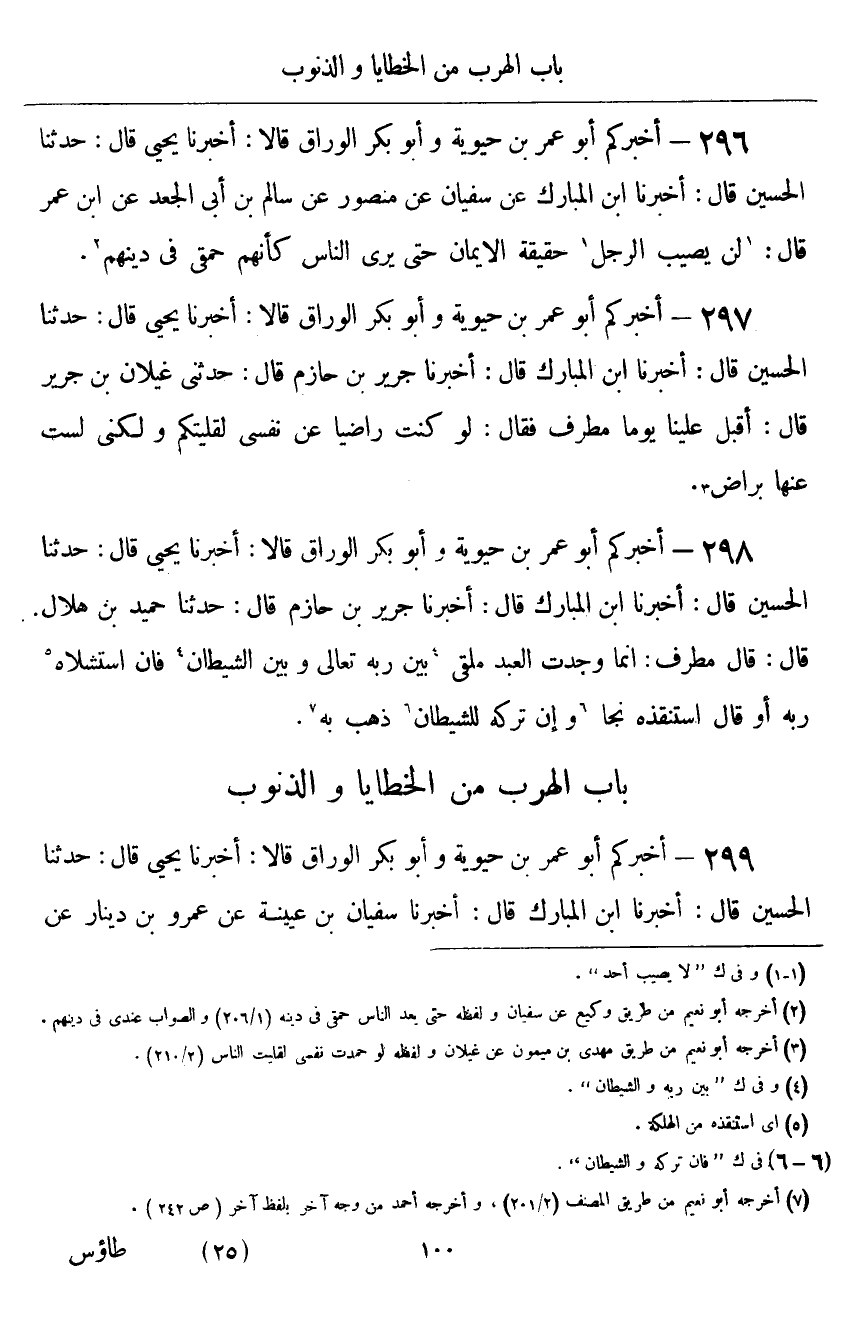 ٢٩٧ - أَخْبَرَكُمْ أَبُو عُمَرَ بْنُ حَيَوَيْهِ، وَأَبُو بَكْرٍ الْوَرَّاقُ قَالَا: أَخْبَرَنَا يَحْيَى قَالَ: حَدَّثَنَا الْحُسَيْنُ قَالَ: أَخْبَرَنَا ابْنُ الْمُبَارَكِ قَالَ: أَخْبَرَنَا جَرِيرُ بْنُ حَازِمٍ قَالَ: حَدَّثَنِي غَيْلَانُ بْنُ جَرِيرٍ قَالَ: أَقْبَلَ عَلَيْنَا يَوْمًا مُطَرِّفٌ، فَقَالَ: «لَوْ كُنْتُ رَاضِيًا عَنْ نَفْسِي لقَلَيْتُكُمْ، وَلَكِنِّي لَسْتُ عَنْهَا بِرَاضٍ»