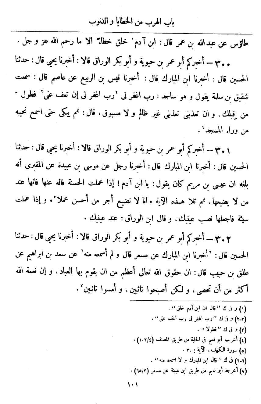 ٣٠٢ - أَخْبَرَكُمْ أَبُو عُمَرَ بْنُ حَيَوَيْهِ، وَأَبُو بَكْرٍ الْوَرَّاقُ قَالَا: أَخْبَرَنَا يَحْيَى قَالَ: حَدَّثَنَا الْحُسَيْنُ قَالَ: أَخْبَرَنَا ابْنُ الْمُبَارَكِ قَالَ: عَنْ مِسْعَرٍ قَالَ: وَلَمْ أَسْمَعْهُ مِنْهُ، عَنْ سَعْدِ بْنِ إِبْرَاهِيمَ، عَنْ طَلْقِ بْنِ حَبِيبٍ قَالَ: «إِنَّ حُقُوقَ اللَّهِ تَعَالَى أَعْظَمُ مِنْ أَنْ يَقُومَ بِهَا الْعِبَادُ، وَإِنَّ نِعْمَةَ اللَّهِ أَكْثَرُ مِنْ أَنْ تُحْصَى، وَلَكِنْ أَصْبِحُوا تَائِبِينَ، وَأَمْسُوا تَائِبِينَ»