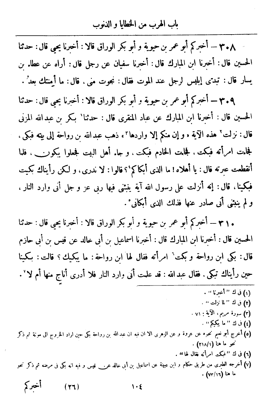 ٣١٠ - أَخْبَرَكُمْ أَبُو عُمَرَ بْنُ حَيَوَيْهِ، وَأَبُو بَكْرٍ الْوَرَّاقُ قَالَا: أَخْبَرَنَا يَحْيَى قَالَ: حَدَّثَنَا الْحُسَيْنُ قَالَ: أَخْبَرَنَا ابْنُ الْمُبَارَكِ قَالَ: أَخْبَرَنَا إِسْمَاعِيلُ بْنُ أَبِي خَالِدٍ، عَنْ قَيْسِ بْنِ أَبِي حَازِمٍ قَالَ: بَكَى ابْنُ رَوَاحَةَ، وَبَكَتِ امْرَأَتُهُ، فَقَالَ لَهَا ابْنُ رَوَاحَةَ: «مَا يُبْكِيكِ؟» قَالَتْ: بَكَيْنَا حِينَ رَأَيْنَاكَ تَبْكِي، فَقَالَ عَبْدُ اللَّهِ: «قَدْ عَلِمْتُ أَنِّي وَارِدٌ النَّارَ، فَلَا أَدْرِي أَنَاجٍ مِنْهَا أَمْ لَا؟»