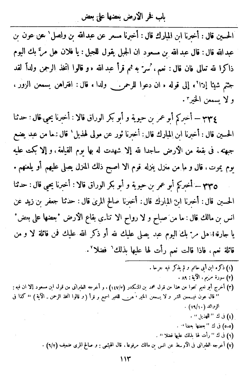 ٣٣٥ - أَخْبَرَكُمْ أَبُو عُمَرَ بْنُ حَيَوَيْهِ، وَأَبُو بَكْرٍ الْوَرَّاقُ قَالَا: أَخْبَرَنَا يَحْيَى قَالَ: حَدَّثَنَا الْحُسَيْنُ قَالَ: أَخْبَرَنَا ابْنُ الْمُبَارَكِ قَالَ: أَخْبَرَنَا صَالِحٌ الْمُرِّيُّ قَالَ: حَدَّثَنَا جَعْفَرُ بْنُ زَيْدٍ، عَنْ أَنَسِ بْنِ مَالِكٍ قَالَ: " مَا مِنْ صَبَاحٍ، وَلَا رَوَاحٍ، إِلَّا تُنَادِي بِقَاعُ الْأَرْضِ بَعْضُهَا عَلَى بَعْضٍ، يَا جَارَةُ، هَلْ مَرَّ بِكِ الْيَوْمَ عَبْدٌ يُصَلِّي عَلَيْكِ لِلَّهِ؟ أَوْ ذَكَرَ اللَّهَ عَلَيْكِ؟ فَمِنْ قَائِلَةٍ: لَا، وَمِنْ قَائِلَةٍ: نَعَمْ، فَإِذَا قَالَتْ: نَعَمْ، رَأَتْ لَهَا عَلَيْهَا بِذَلِكَ فَضْلًا "