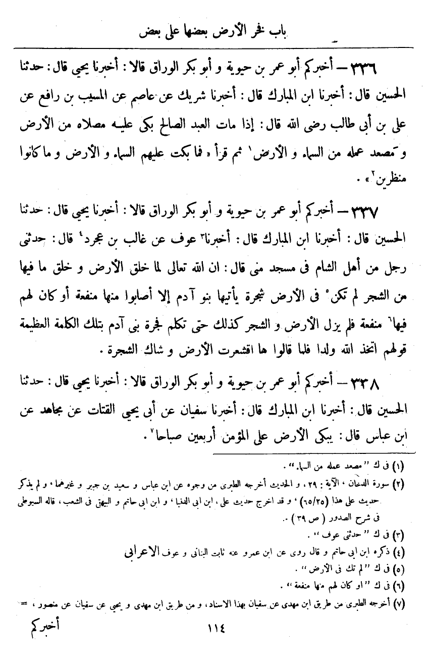 ٣٣٨ - أَخْبَرَكُمْ أَبُو عُمَرَ بْنُ حَيَوَيْهِ، وَأَبُو بَكْرٍ الْوَرَّاقُ قَالَا: أَخْبَرَنَا يَحْيَى قَالَ: حَدَّثَنَا الْحُسَيْنُ قَالَ: أَخْبَرَنَا ابْنُ الْمُبَارَكِ قَالَ: أَخْبَرَنَا سُفْيَانُ، عَنْ أَبِي يَحْيَى الْقَتَّاتِ، عَنْ مُجَاهِدٍ، عَنِ ابْنِ عَبَّاسٍ قَالَ: «تَبْكِي الْأَرْضُ عَلَى الْمُؤْمِنِ أَرْبَعِينَ صَبَاحًا»