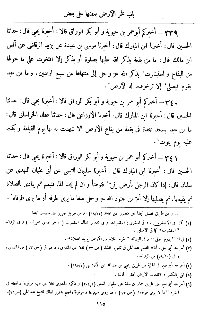 ٣٣٩ - أَخْبَرَكُمْ أَبُو عُمَرَ بْنُ حَيَوَيْهِ، وَأَبُو بَكْرٍ الْوَرَّاقُ قَالَا: أَخْبَرَنَا يَحْيَى قَالَ: حَدَّثَنَا الْحُسَيْنُ قَالَ: أَخْبَرَنَا ابْنُ الْمُبَارَكِ قَالَ: أَخْبَرَنَا مُوسَى بْنُ عُبَيْدَةَ، عَنْ يَزِيدَ الرَّقَاشِيِّ، عَنْ أَنَسِ بْنِ مَالِكٍ قَالَ: «مَا مِنْ بُقْعَةٍ يُذْكَرُ اللَّهُ عَلَيْهَا بِصَلَاةٍ، أَوْ بِذِكْرٍ، إِلَّا افْتَخَرَتْ عَلَى مَا حَوْلَهَا مِنَ الْبِقَاعِ، وَاسْتَبْشَرَتْ بِذِكْرِ اللَّهِ عَزَّ وَجَلَّ إِلَى مُنْتَهَاهَا مِنْ سَبْعِ أَرَضِينَ، وَمَا مِنْ عَبْدٍ يَقُومُ فَيُصَلِّي، إِلَّا تَزَخْرَفَتْ لَهُ الْأَرْضُ»
