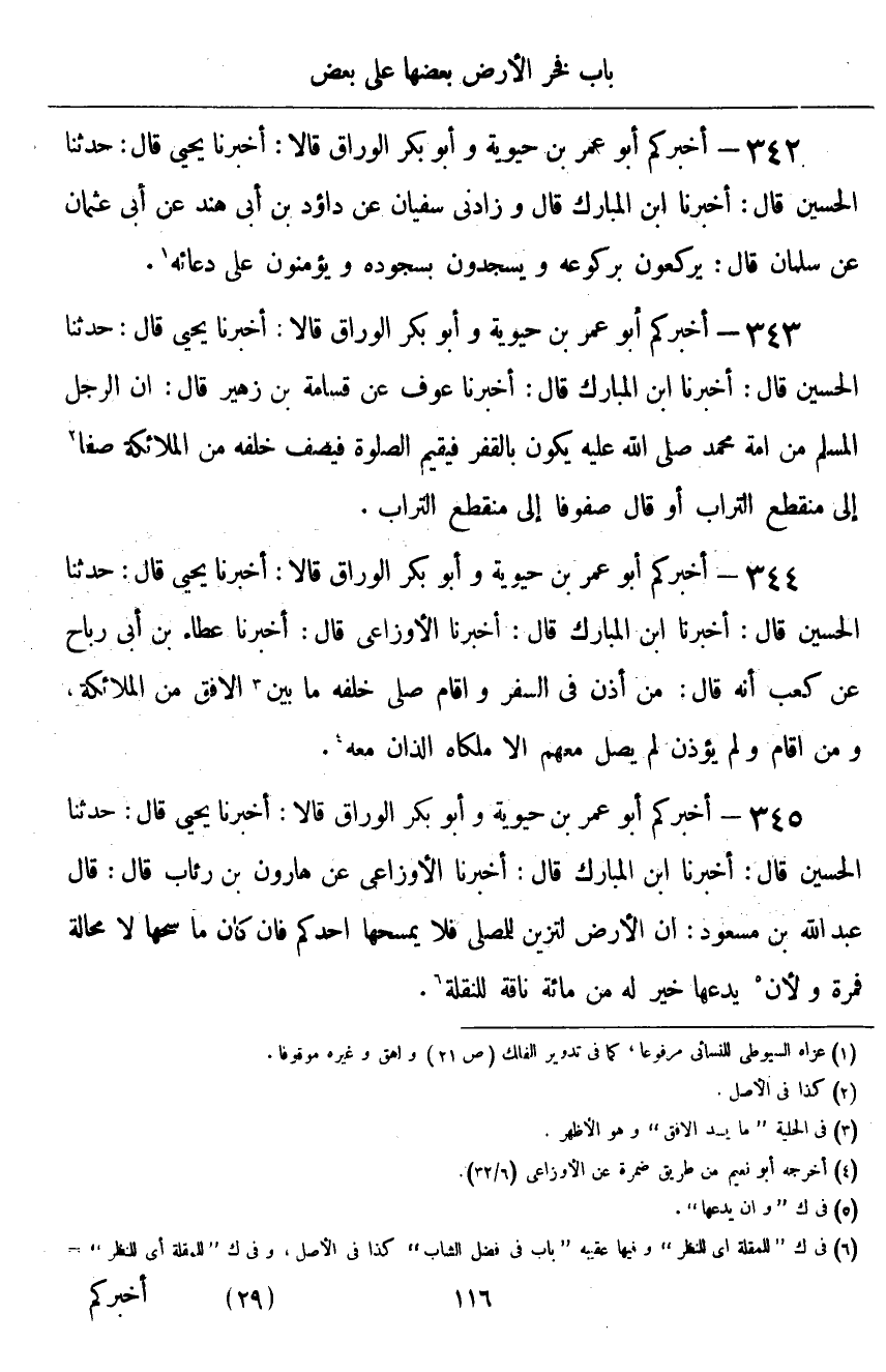 ٣٤٣ - أَخْبَرَكُمْ أَبُو عُمَرَ بْنُ حَيَوَيْهِ، وَأَبُو بَكْرٍ الْوَرَّاقُ قَالَا: أَخْبَرَنَا يَحْيَى قَالَ: حَدَّثَنَا الْحُسَيْنُ قَالَ: أَخْبَرَنَا ابْنُ الْمُبَارَكِ قَالَ: أَخْبَرَنَا عَوْفٌ، عَنْ قَسَامَةَ بْنِ زُهَيْرٍ قَالَ: «إِنَّ الرَّجُلَ الْمُسْلِمَ مِنْ أُمَّةِ مُحَمَّدٍ صَلَّى اللهُ عَلَيْهِ وَسَلَّمَ يَكُونُ بِالْقَفْرِ، فَيُقِيمُ الصَّلَاةَ، فَيُصَفُّ خَلْفَهُ مِنَ الْمَلَائِكَةِ صَفٌّ إِلَى مُنْقَطَعِ التُّرَابِ» أَوْ قَالَ: «صُفُوفٌ إِلَى مُنْقَطَعِ التُّرَابِ»