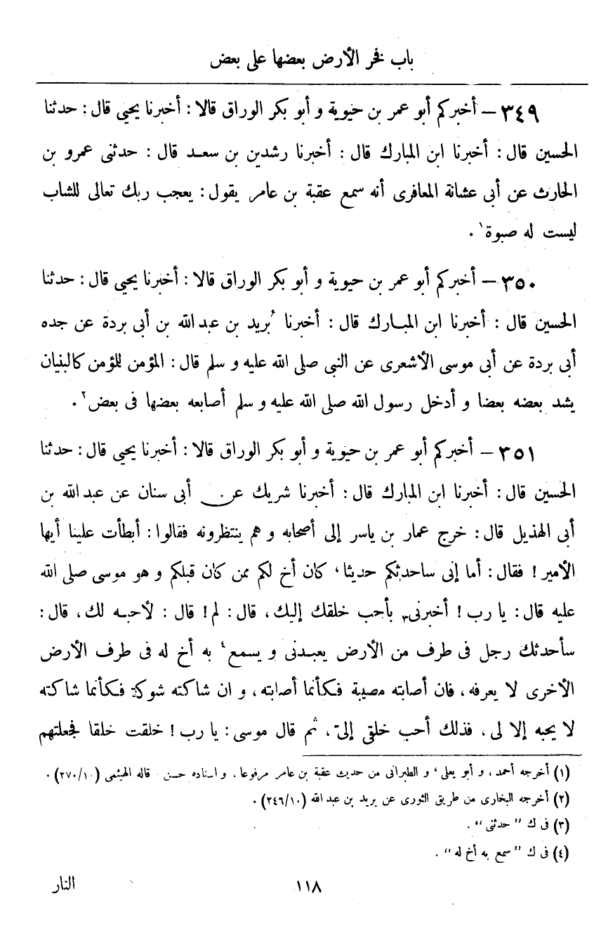 ٣٥١ - أَخْبَرَكُمْ أَبُو عُمَرَ بْنُ حَيَوَيْهِ، وَأَبُو بَكْرٍ الْوَرَّاقُ قَالَا: أَخْبَرَنَا يَحْيَى قَالَ: حَدَّثَنَا الْحُسَيْنُ قَالَ: أَخْبَرَنَا ابْنُ الْمُبَارَكِ قَالَ: أَخْبَرَنَا شَرِيكٌ، عَنْ أَبِي سِنَانٍ، عَنْ عَبْدِ اللَّهِ بْنِ أَبِي الْهُذَيْلِ قَالَ: خَرَجَ عَمَّارُ بْنُ يَاسِرٍ إِلَى أَصْحَابِهِ وَهُمْ يَنْتَظِرُونَهُ، فَقَالُوا: أَبْطَأْتَ عَلَيْنَا أَيُّهَا الْأَمِيرُ، فَقَالَ: أَمَا إِنِّي سَأُحَدِّثُكُمْ حَدِيثًا، " كَانَ أَخٌ لَكُمْ مِمَّنْ كَانَ قَبْلَكُمْ وَهُوَ مُوسَى صَلَّى اللهُ عَلَيْهِ وَسَلَّمَ قَالَ: يَا رَبِّ، أَخْبَرَنِي بِأَحَبِّ خَلْقِكَ إِلَيْكَ، قَالَ: لِمَ؟ قَالَ: لِأُحِبَّهُ لَكَ، قَالَ: سَأُحَدِّثُكَ , رَجُلٌ فِي طَرَفٍ مِنَ الْأَرْضِ يَعْبُدُنِي وَيَسْمَعُ بِهِ أَخٌ لَهُ فِي طَرَفِ الْأَرْضِ الْأُخْرَى لَا يَعْرِفُهُ، فَإِنْ أَصَابَتْهُ مُصِيبَةٌ فَكَأَنَّمَا أَصَابَتْهُ، وَإِنْ شَاكَتْهُ شَوْكَةٌ فَكَأَنَّمَا شَاكَتْهُ، لَا يُحِبُّهُ إِلَّا لِي، فَذَلِكَ أَحَبُّ خَلْقِي إِلَيَّ، ثُمَّ قَالَ مُوسَى: يَا رَبِّ، خَلَقْتَ خَلْقًا فَجَعَلْتَهُمْ ⦗١١٩⦘ فِي النَّارِ، فَأَوْحَى اللَّهُ تَعَالَى إِلَيْهِ: أَنْ يَا مُوسَى، ازْرَعْ زَرْعًا، فَزَرَعَهُ، وَسَقَاهُ، وَقَامَ عَلَيْهِ حَتَّى حَصَدَهُ، وَدَاسَهُ، فَقَالَ لَهُ: مَا فَعَلَ زَرْعُكَ يَا مُوسَى؟ قَالَ: رَفَعْتُهُ، قَالَ: فَمَا تَرَكْتَ مِنْهُ؟ قَالَ: مَا لَا خَيْرَ فِيهِ، قَالَ: فَإِنِّي لَا أُدْخِلُ النَّارَ إِلَّا مَنْ لَا خَيْرَ فِيهِ "