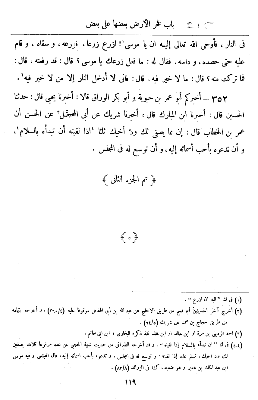 ٣٥٢ - أَخْبَرَكُمْ أَبُو عُمَرَ بْنُ حَيَوَيْهِ، وَأَبُو بَكْرٍ الْوَرَّاقُ قَالَا: أَخْبَرَنَا يَحْيَى قَالَ: حَدَّثَنَا الْحُسَيْنُ قَالَ: أَخْبَرَنَا ابْنُ الْمُبَارَكِ قَالَ: أَخْبَرَنَا شَرِيكٌ، عَنْ أَبِي الْمُحَجَّلِ، عَنِ الْحَسَنِ، أَنَّ عُمَرَ بْنَ الْخَطَّابِ قَالَ: " إِنَّ مِمَّا يُصَفِّي لَكَ وُدَّ أَخِيكَ ثَلَاثًا: إِذَا لَقِيتَهُ أَنْ تَبْدَأَهُ بِالسَّلَامِ، وَأَنْ تَدْعُوَهُ بِأَحَبِّ أَسْمَائِهِ إِلَيْهِ، وَأَنْ تُوَسِّعَ لَهُ فِي الْمَجْلِسِ "