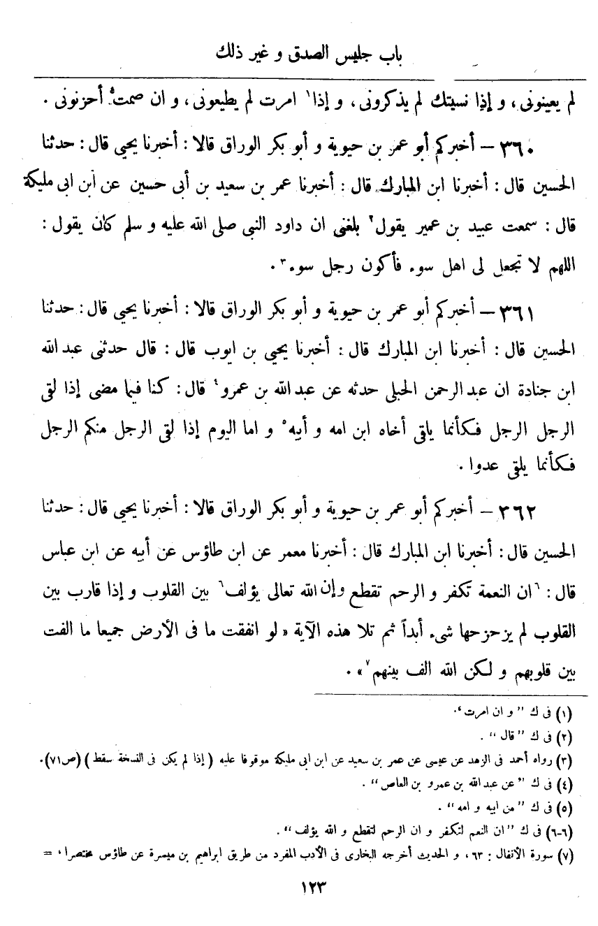 ٣٦٢ - أَخْبَرَكُمْ أَبُو عُمَرَ بْنُ حَيَوَيْهِ، وَأَبُو بَكْرٍ الْوَرَّاقُ قَالَا: أَخْبَرَنَا يَحْيَى قَالَ: حَدَّثَنَا الْحُسَيْنُ قَالَ: أَخْبَرَنَا ابْنُ الْمُبَارَكِ قَالَ: أَخْبَرَنَا مَعْمَرٌ، عَنِ ابْنِ طَاوُسٍ، عَنْ أَبِيهِ، عَنِ ابْنِ عَبَّاسٍ قَالَ: " إِنَّ النِّعْمَةَ تُكْفَرُ، وَالرَّحِمَ تُقْطَعُ، وَإِنَّ اللَّهَ تَعَالَى يُؤَلِّفُ بَيْنَ الْقُلُوبِ، وَإِذَا قَارَبَ بَيْنَ الْقُلُوبِ لَمْ يُزَحْزِحْهَا شَيْءٌ أَبَدًا، ثُمَّ تَلَا هَذِهِ الْآيَةَ: {لَوْ أَنْفَقْتَ مَا فِي الْأَرْضِ جَمِيعًا مَا أَلَّفْتَ بَيْنَ قُلُوبِهِمْ وَلَكِنَّ اللَّهَ أَلَّفَ بَيْنَهُمْ} [الأنفال: ٦٣]
