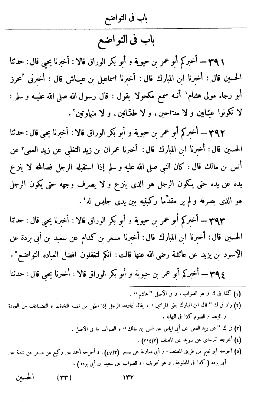 ٣٩٣ - أَخْبَرَكُمْ أَبُو عُمَرَ بْنُ حَيَوَيْهِ، وَأَبُو بَكْرٍ الْوَرَّاقُ قَالَا: أَخْبَرَنَا يَحْيَى قَالَ: حَدَّثَنَا الْحُسَيْنُ قَالَ: أَخْبَرَنَا ابْنُ الْمُبَارَكِ قَالَ: أَخْبَرَنَا مِسْعَرُ بْنُ كِدَامٍ، عَنْ سَعِيدِ بْنِ أَبِي بُرْدَةَ، عَنِ الْأَسْوَدِ بْنِ يَزِيدَ، عَنْ عَائِشَةَ رَضِيَ اللَّهُ عَنْهَا، قَالَتْ: " إِنَّكُمْ لَتُغْفِلُونَ أَفْضَلَ الْعِبَادَةِ: التَّوَاضُعَ "