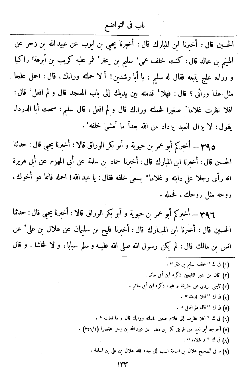 ٣٩٥ - أَخْبَرَكُمْ أَبُو عُمَرَ بْنُ حَيَوَيْهِ، وَأَبُو بَكْرٍ الْوَرَّاقُ قَالَا: أَخْبَرَنَا يَحْيَى قَالَ: حَدَّثَنَا الْحُسَيْنُ قَالَ: أَخْبَرَنَا ابْنُ الْمُبَارَكِ قَالَ: أَخْبَرَنَا حَمَّادُ بْنُ سَلَمَةَ، عَنْ أَبِي الْمُهَزِّمِ، عَنْ أَبِي هُرَيْرَةَ، أَنَّهُ رَأَى رَجُلًا عَلَى دَابَّتِهِ وَغُلَامًا يَسْعَى خَلْفَهُ، فَقَالَ: «يَا عَبْدَ اللَّهِ، احْمِلْهُ فَإِنَّمَا هُوَ أَخُوكَ، رُوحُهُ مِثْلُ رُوحِكَ، فَحَمَلَهُ»