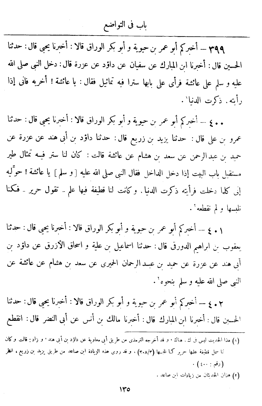 ٣٩٩ - أَخْبَرَكُمْ أَبُو عُمَرَ بْنُ حَيَوَيْهِ، وَأَبُو بَكْرٍ الْوَرَّاقُ قَالَا: أَخْبَرَنَا يَحْيَى قَالَ: حَدَّثَنَا الْحُسَيْنُ قَالَ: أَخْبَرَنَا ابْنُ الْمُبَارَكِ، عَنْ سُفْيَانَ، عَنْ دَاوُدَ، عَنْ عَزْرَةَ، قَالَ: دَخَلَ النَّبِيُّ صَلَّى اللهُ عَلَيْهِ وَسَلَّمَ عَلَى عَائِشَةَ فَرَأَى عَلَى بَابِهَا سِتْرًا فِيهِ تَمَاثِيلُ، فَقَالَ: «يَا عَائِشَةُ، أَخِّرِيهِ فَإِنِّي إِذَا رَأَيْتُهُ ذَكَرْتُ الدُّنْيَا»
