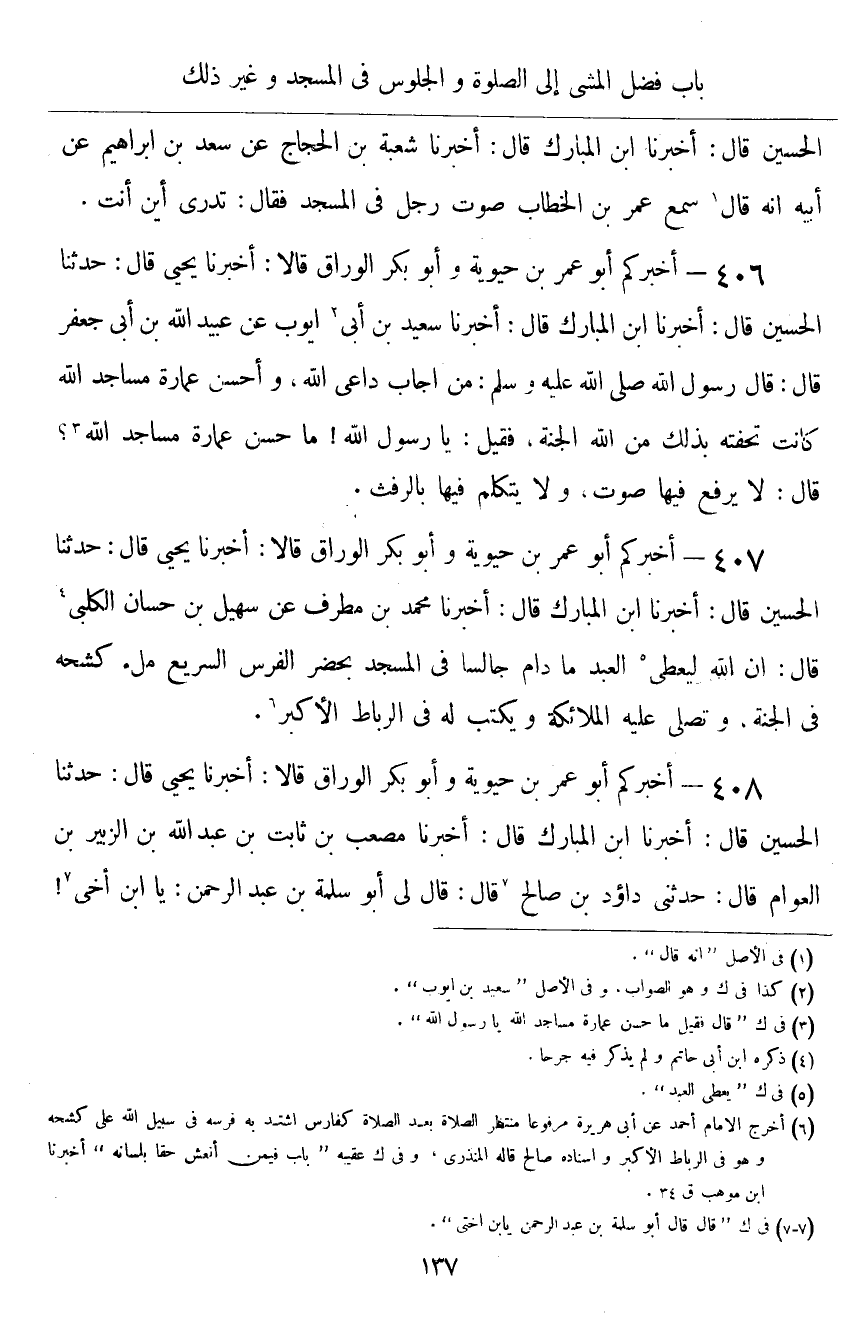 ٤٠٦ - أَخْبَرَكُمْ أَبُو عُمَرَ بْنُ حَيَوَيْهِ، وَأَبُو بَكْرٍ الْوَرَّاقُ قَالَا: أَخْبَرَنَا يَحْيَى قَالَ: حَدَّثَنَا الْحُسَيْنُ قَالَ: أَخْبَرَنَا ابْنُ الْمُبَارَكِ قَالَ: أَخْبَرَنَا سَعِيدُ بْنُ أَبِي أَيُّوبَ، عَنْ عُبَيْدِ اللَّهِ بْنِ أَبِي جَعْفَرٍ، قَالَ: قَالَ رَسُولُ اللَّهِ صَلَّى اللهُ عَلَيْهِ وَسَلَّمَ: «مَنْ أَجَابَ دَاعِيَ اللَّهِ، وَأَحْسَنَ عِمَارَةَ مَسَاجِدِ اللَّهِ، كَانَتْ تُحْفَتُهُ بِذَلِكَ مِنَ اللَّهِ الْجَنَّةَ» ، فَقِيلَ: يَا رَسُولَ اللَّهِ، مَا حُسْنُ عِمَارَةِ مَسَاجِدِ اللَّهِ؟ قَالَ: «لَا يُرْفَعُ فِيهَا صَوْتٌ، وَلَا يُتَكَلَّمُ فِيهَا بِالرَّفَثِ»
