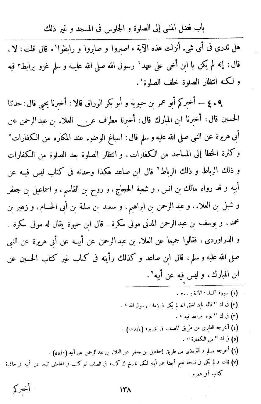 ٤٠٩ - أَخْبَرَكُمْ أَبُو عُمَرَ بْنُ حَيَوَيْهِ، وَأَبُو بَكْرٍ الْوَرَّاقُ قَالَا: أَخْبَرَنَا يَحْيَى قَالَ: حَدَّثَنَا الْحُسَيْنُ قَالَ: أَخْبَرَنَا ابْنُ الْمُبَارَكِ قَالَ: أَخْبَرَنَا مُطَرِّفٌ، عَنِ الْعَلَاءِ بْنِ عَبْدِ الرَّحْمَنِ، عَنْ أَبِي هُرَيْرَةَ، عَنِ النَّبِيِّ صَلَّى اللهُ عَلَيْهِ وَسَلَّمَ قَالَ: «إِسْبَاغُ الْوُضُوءِ عِنْدَ الْمَكَارِهِ مِنَ الْكَفَّارَاتِ، وَكَثْرَةُ الْخُطَا إِلَى الْمَسَاجِدِ مِنَ الْكَفَّارَاتِ، وَانتْظَارُ الصَّلَاةِ بَعْدَ الصَّلَاةِ مِنَ الْكَفَّارَاتِ، وَذَلِكَ الرِّبَاطُ، وَذَلِكَ الرِّبَاطُ» ، قَالَ ابْنُ صَاعِدٍ: " هَكَذَا وَجَدْتُهُ فِي كِتَابٍ لَيْسَ فِيهِ، عَنْ أَبِيهِ وَقَدْ رَوَاهُ مَالِكُ بْنُ أَنَسٍ، وَشُعْبَةُ بْنُ الْحَجَّاجُ، وَرَوْحُ بْنُ الْقَاسِمِ، وَإِسْمَاعِيلُ بْنُ جَعْفَرٍ، وَشِبْلُ بْنُ الْعَلَاءِ، وَعَبْدُ الرَّحْمَنِ بْنُ إِبْرَاهِيمَ، وَسَعِيدُ بْنُ سَلَمَةَ بْنِ أَبِي الْحُسَامِ، وَزُهَيْرُ بْنُ مُحَمَّدٍ، وَيُوسُفُ بْنُ عَبْدِ الرَّحْمَنِ الْمَدَنِيُّ مَوْلَى سُكَّرَةَ قَالَ ابْنُ حَيْوَةَ: «يُقَالُ لَهُ مَوْلَى سُكَّرَةَ» - وَالدَّرَاوَرْدِيُّ، فَقَالُوا جَمِيعًا: عَنِ الْعَلَاءِ بْنِ عَبْدِ الرَّحْمَنِ، عَنْ أَبِيهِ، عَنْ أَبِي هُرَيْرَةَ، عَنِ النَّبِيِّ صَلَّى اللهُ عَلَيْهِ وَسَلَّمَ "، قَالَ ابْنُ صَاعِدٍ: «وَكَذَلِكَ رَأَيْتُهُ فِي كِتَابٍ غَيْرِ كِتَابِ الْحُسَيْنِ، عَنِ ابْنِ الْمُبَارَكِ، وَلَيْسَ فِيهِ، عَنْ أَبِيهِ»