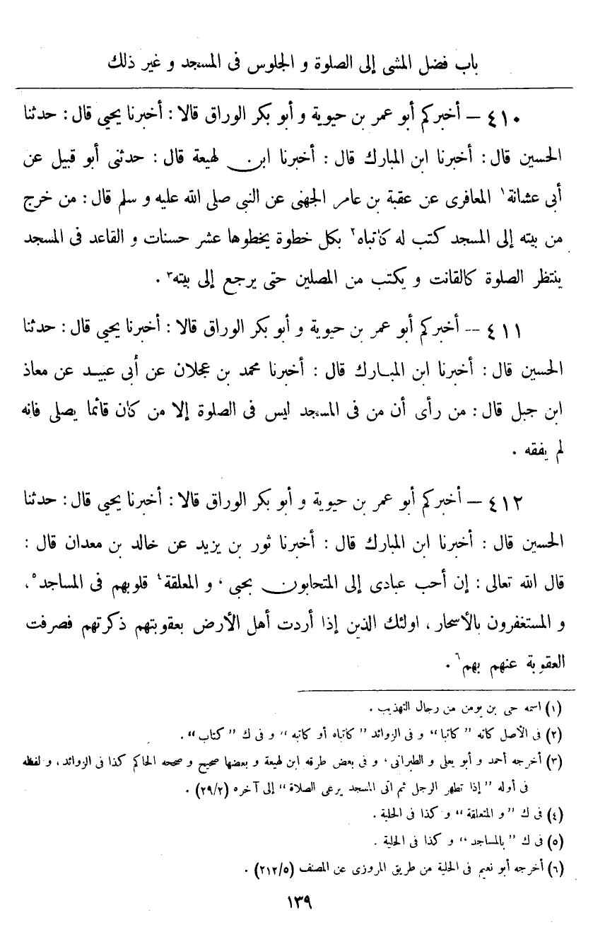 ٤١٠ - أَخْبَرَكُمْ أَبُو عُمَرَ بْنُ حَيَوَيْهِ، وَأَبُو بَكْرٍ الْوَرَّاقُ قَالَا: أَخْبَرَنَا يَحْيَى قَالَ: حَدَّثَنَا الْحُسَيْنُ قَالَ: أَخْبَرَنَا ابْنُ الْمُبَارَكِ قَالَ: أَخْبَرَنَا ابْنُ لَهِيعَةَ قَالَ: حَدَّثَنِي أَبُو قَبِيلٍ، عَنْ أَبِي عُشَّانَةَ الْمَعَافِرِيِّ، عَنْ عُقْبَةَ بْنِ عَامِرٍ الْجُهَنِيِّ، عَنِ النَّبِيِّ صَلَّى اللهُ عَلَيْهِ وَسَلَّمَ قَالَ: «مَنْ خَرَجَ مِنْ بَيْتِهِ إِلَى الْمَسْجِدِ، كَتَبَ لَهُ كَاتِبَاهُ بِكُلِّ خُطْوَةٍ يَخْطُوهَا عَشْرَ حَسَنَاتٍ، وَالْقَاعِدُ فِي الْمَسْجِدِ يَنْتَظِرُ الصَّلَاةَ كَالْقَانِتِ، وَيُكْتَبُ مِنَ الْمُصَلِّينَ حَتَّى يَرْجِعَ إِلَى بَيْتِهِ»