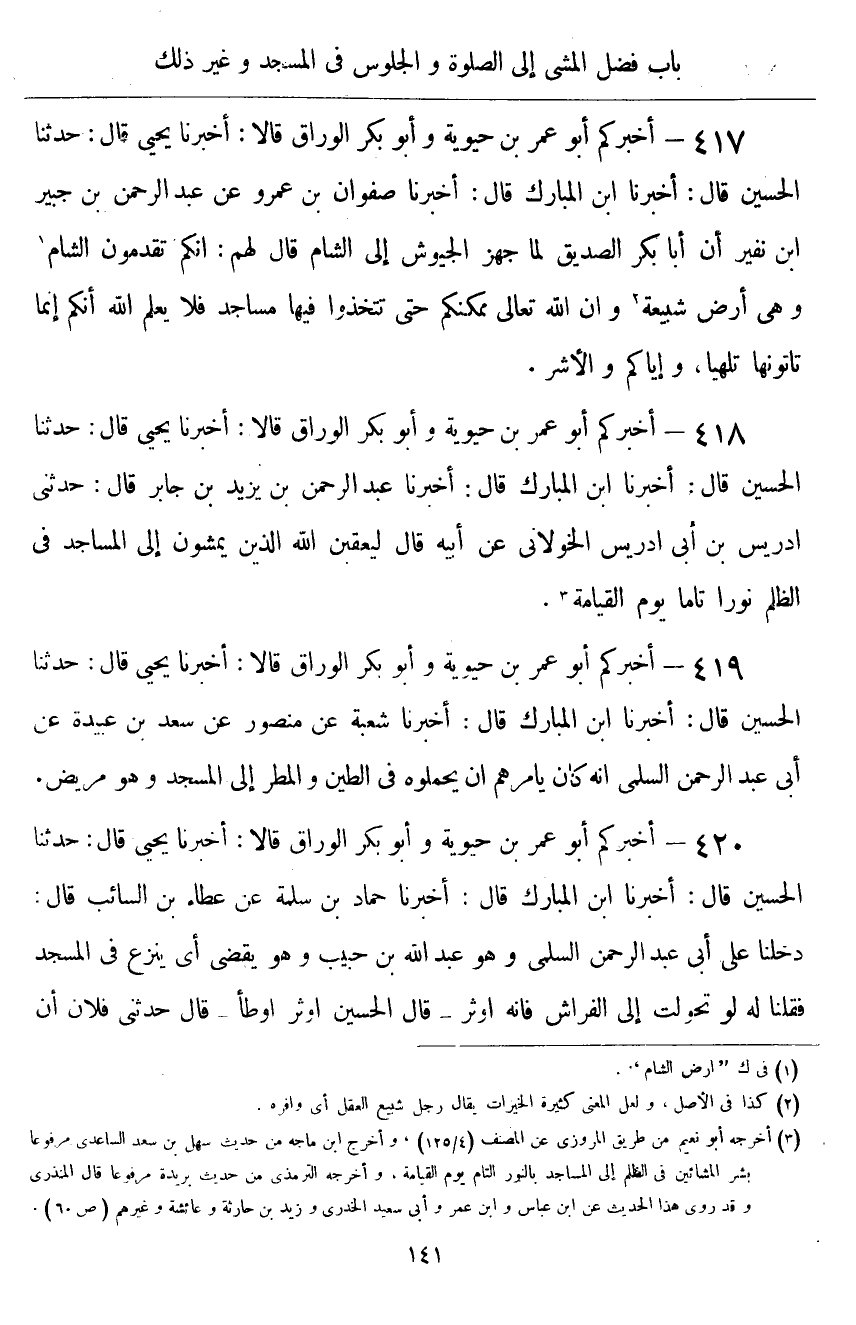 ٤١٨ - أَخْبَرَكُمْ أَبُو عُمَرَ بْنُ حَيَوَيْهِ، وَأَبُو بَكْرٍ الْوَرَّاقُ قَالَا: أَخْبَرَنَا يَحْيَى قَالَ: حَدَّثَنَا الْحُسَيْنُ قَالَ: أَخْبَرَنَا ابْنُ الْمُبَارَكِ قَالَ: أَخْبَرَنَا عَبْدُ الرَّحْمَنِ بْنُ يَزِيدَ بْنِ جَابِرٍ قَالَ: حَدَّثَنِي إِدْرِيسُ بْنُ أَبِي إِدْرِيسَ الْخَوْلَانِيُّ، عَنْ أَبِيهِ قَالَ: «لَيَعْقُبَنَّ اللَّهُ الَّذِينَ يَمْشُونَ إِلَى الْمَسَاجِدِ فِي الظُّلَمِ نُورًا تَامًّا يَوْمَ الْقِيَامَةِ»
